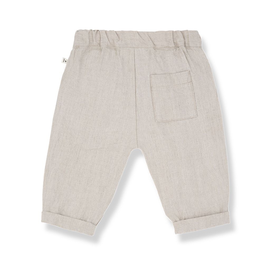 Deze babybroek van 1+ in the family heeft een zachte, natuurlijke uitstraling en is ontworpen voor dagelijks comfort. Het broekje is uitgevoerd in een rustige, licht beige tint en gemaakt van lichtgewicht katoen met een subtiel gemêleerde structuur. De elastische tailleband met koordsluiting zorgt voor een fijne pasvorm en maakt het babybroekje makkelijk aan en uit te trekken. De omgeslagen pijpjes geven de broek een speelse, nonchalante look. Een tijdloze broek die mooi combineert met een shirt, top of sweater.