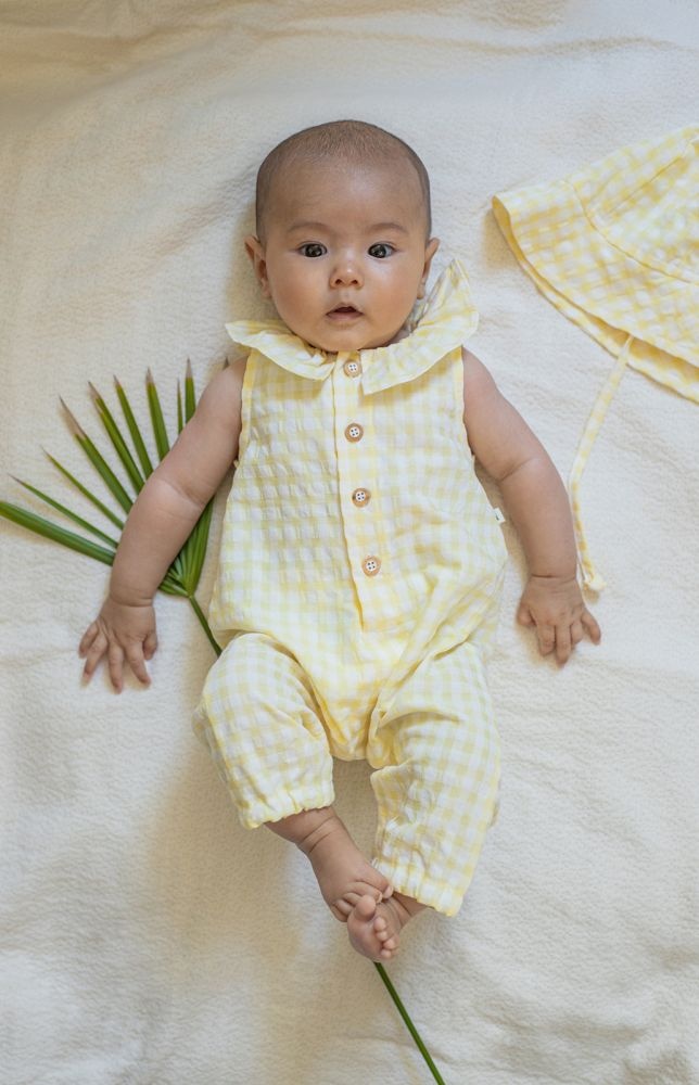 Dit zomerse baby pakje van 1+ in the family in Pastel Yellow is een fijne combinatie van comfort en cuteness. Het boxpakje is uitgevoerd in een zachte, lichtgele gingham ruit. De knoopsluiting aan de voorkant maakt het aan- en uitkleden eenvoudig, ideaal voor dagelijks gebruik. De schouderbandjes met ruche-detail geven het pakje een speelse, zomerse look en maken het perfect voor warmere dagen. Mooi te dragen als baby jumpsuit, los of gecombineerd met een romper eronder.