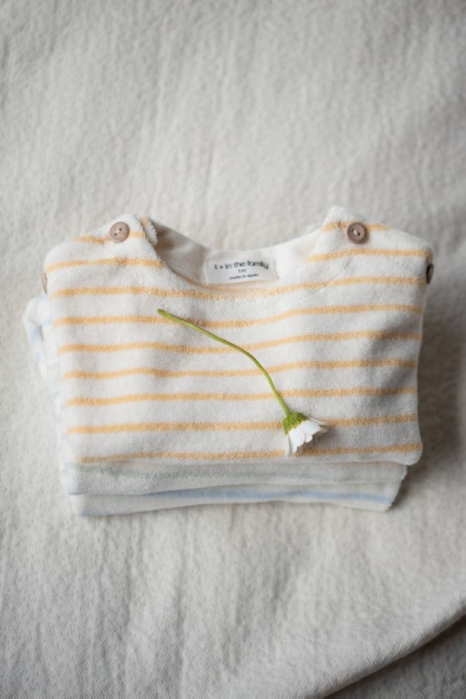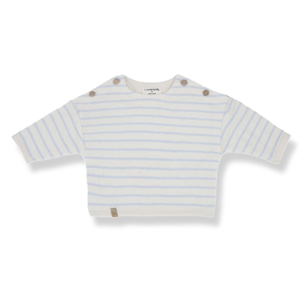Dit zachte badstof baby shirt van One More in the Family is gemaakt van een comfortabele mix van 40% katoen, 40% modal en 20% polyamide. Het shirt heeft lange mouwen en een subtiel streeppatroon in lichtblauw en crème. De knoopjes op de schouders maken het aan- en uitkleden eenvoudig en geven het shirt een speelse, stijlvolle touch. Perfect voor een casual en comfortabele outfit voor je kleintje.