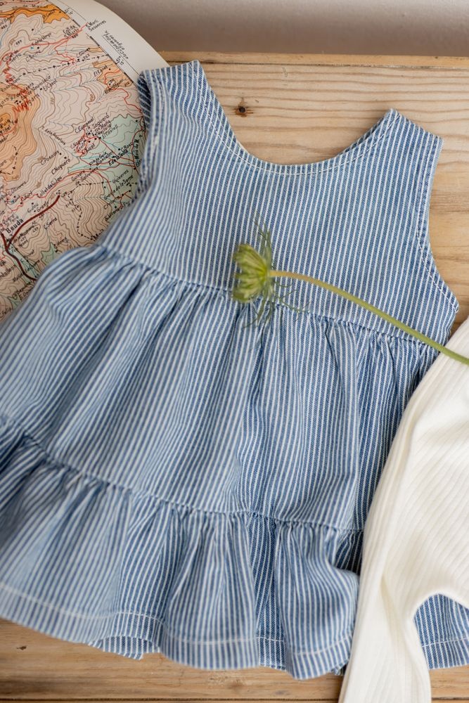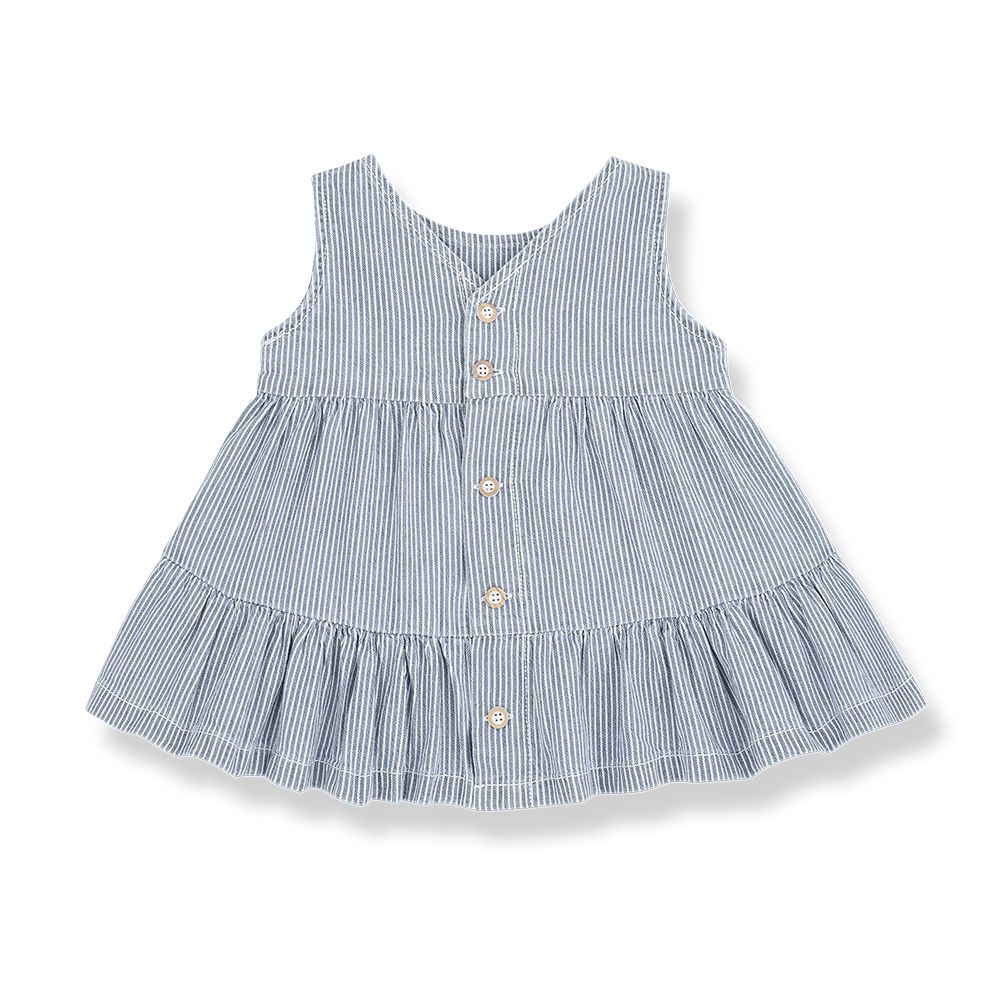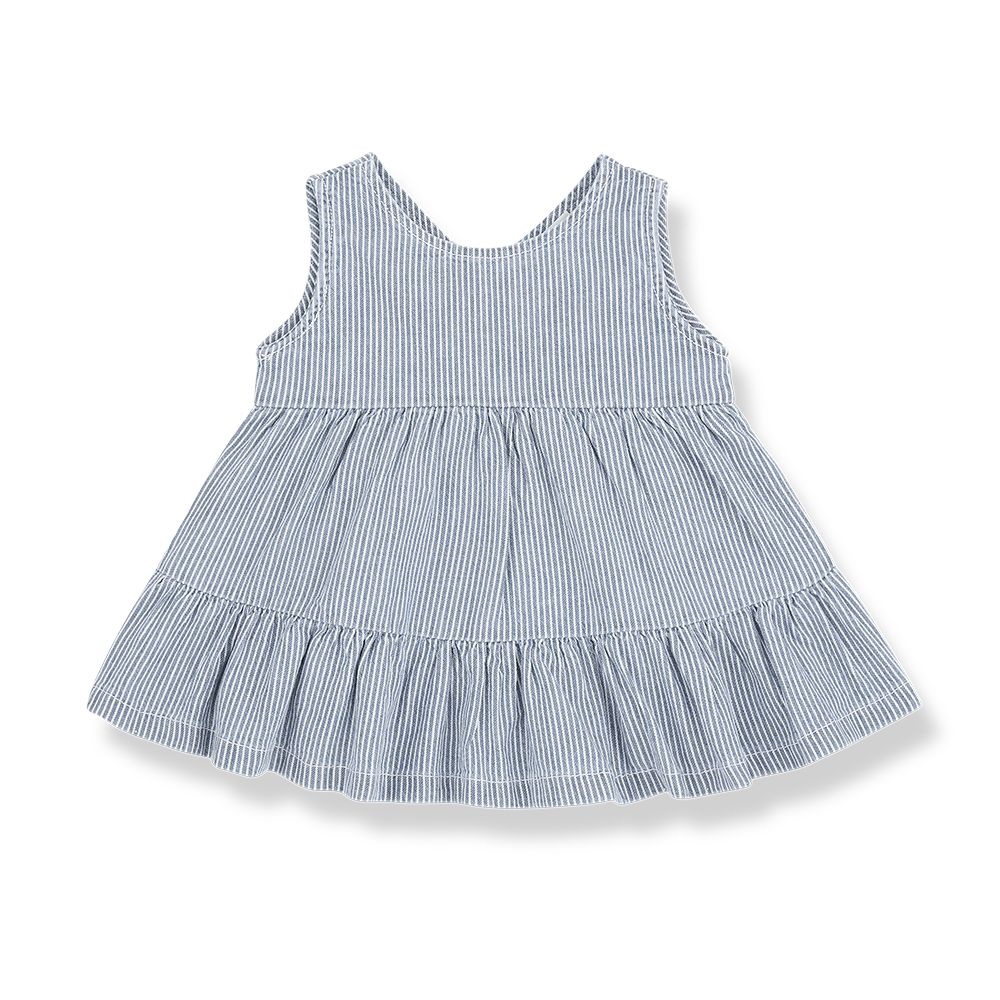 Dit gestreepte jurkje van 1+ in the family is een luchtige en comfortabele jurk voor baby’s en peuters. Het mouwloze jurkje heeft fijne verticale strepen in blauw en wit, wat zorgt voor een rustige en tijdloze uitstraling. De losvallende pasvorm met subtiele plooien en een speelse volant aan de onderkant geeft deze jurk een zacht en vrolijk silhouet. Dankzij de lichte katoenen stof draagt het jurkje prettig en is het ideaal voor dagelijks gebruik. Mooi te combineren met een vestje of bloomer.