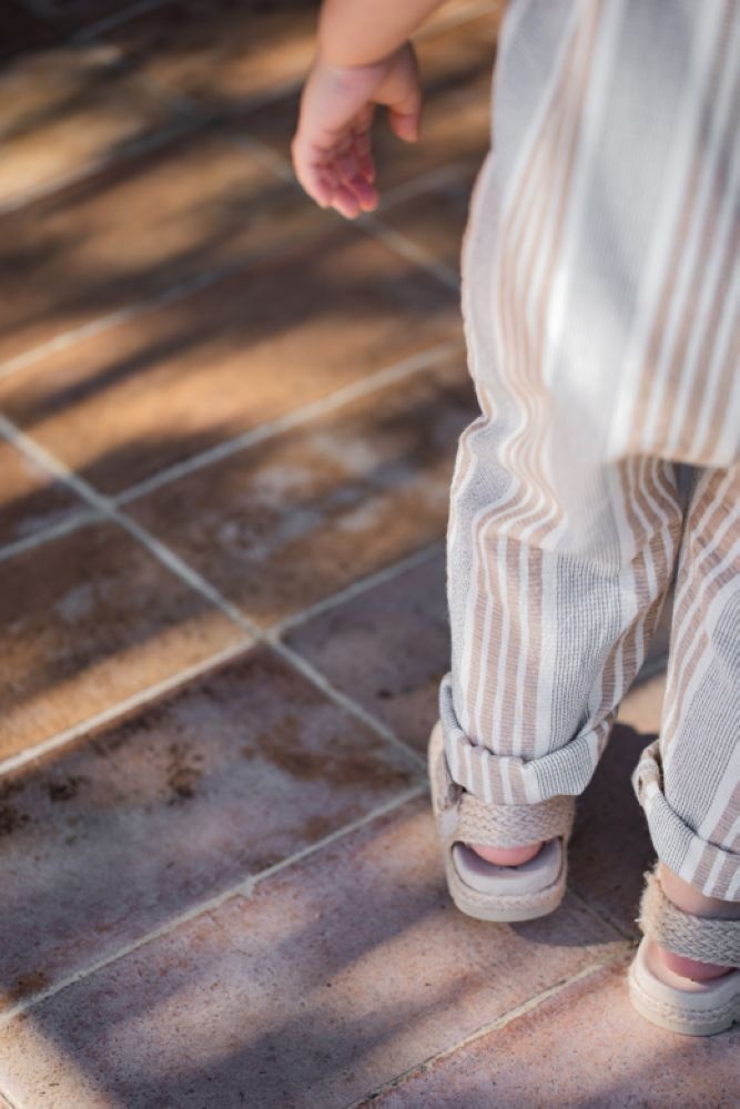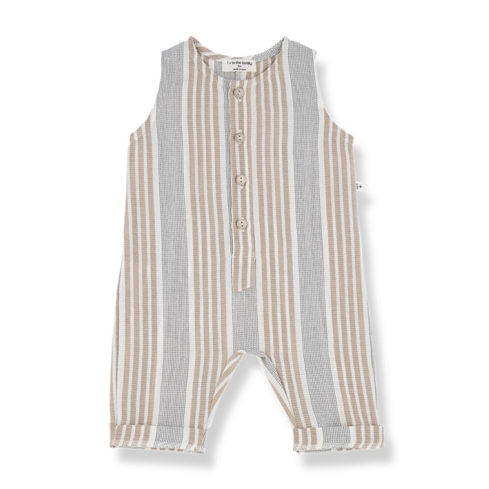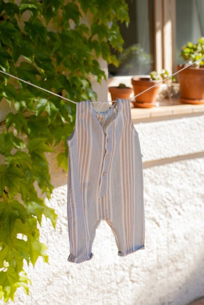 Deze stijlvolle jumpsuit van One More in the Family is gemaakt uit een zachte mix van 68% biologisch katoen en 32% viscose, wat zorgt voor een comfortabele en ademende pasvorm. Het ontwerp heeft een opvallend streeppatroon in neutrale kleuren, perfect voor een speelse en toch stijlvolle look. De knoopsluiting aan de voorkant maakt het aan- en uitkleden eenvoudig, terwijl de losse pasvorm ideaal is voor warme dagen. Een veelzijdige keuze voor een zomerse outfit.