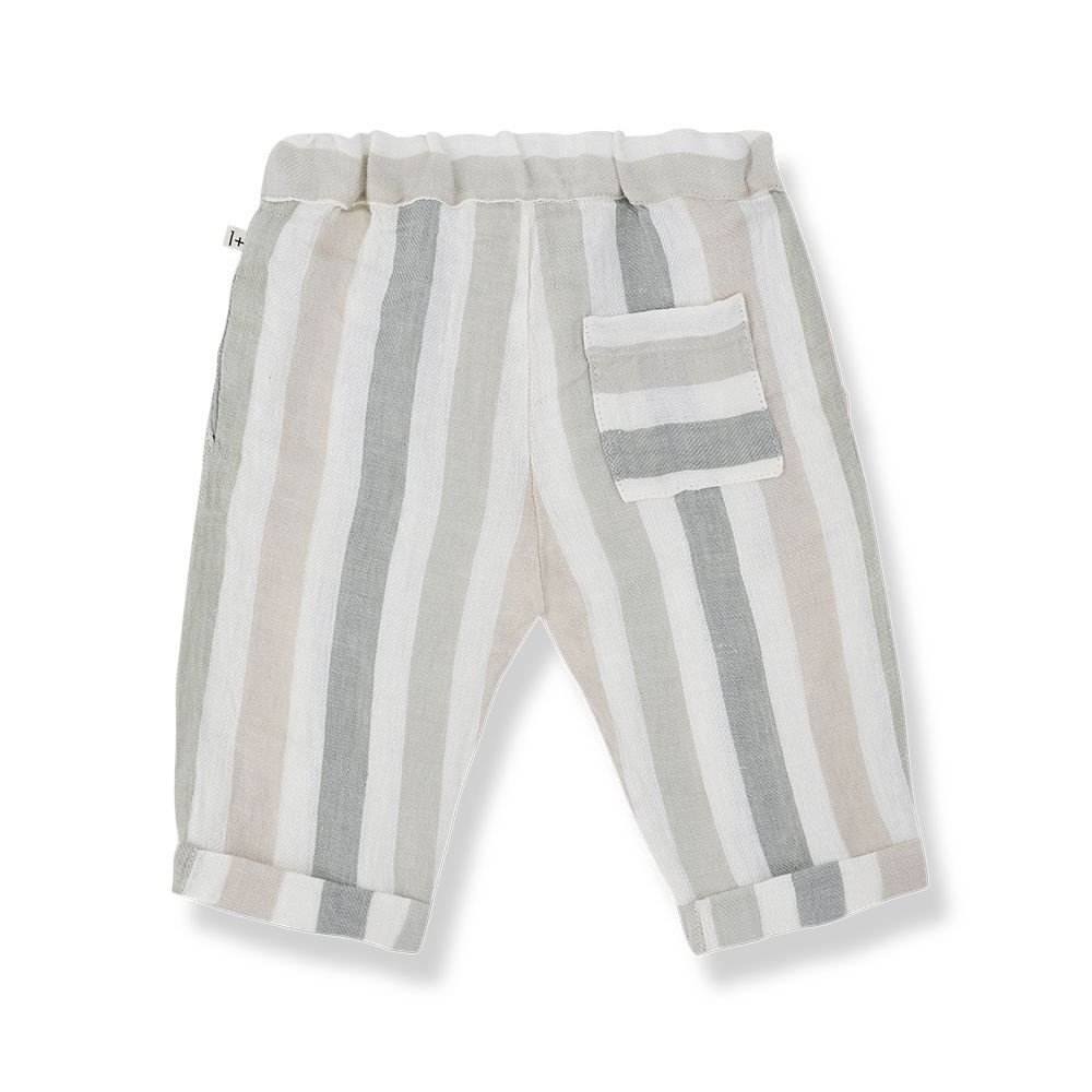Deze babybroek van 1+ in the family is uitgevoerd in een zachte, neutrale streep in tinten beige, off-white en vergrijsd groen. Het broekje is gemaakt van licht en ademend katoen en voelt comfortabel aan op de gevoelige babyhuid. De elastische tailleband met decoratief koord zorgt voor een fijne pasvorm en maakt het aan- en uitkleden eenvoudig. De omgeslagen pijpjes geven de broek een speelse, ontspannen uitstraling. Een tijdloos babybroekje dat mooi combineert met een shirt, top of sweater uit dezelfde rustige kleurlijn.