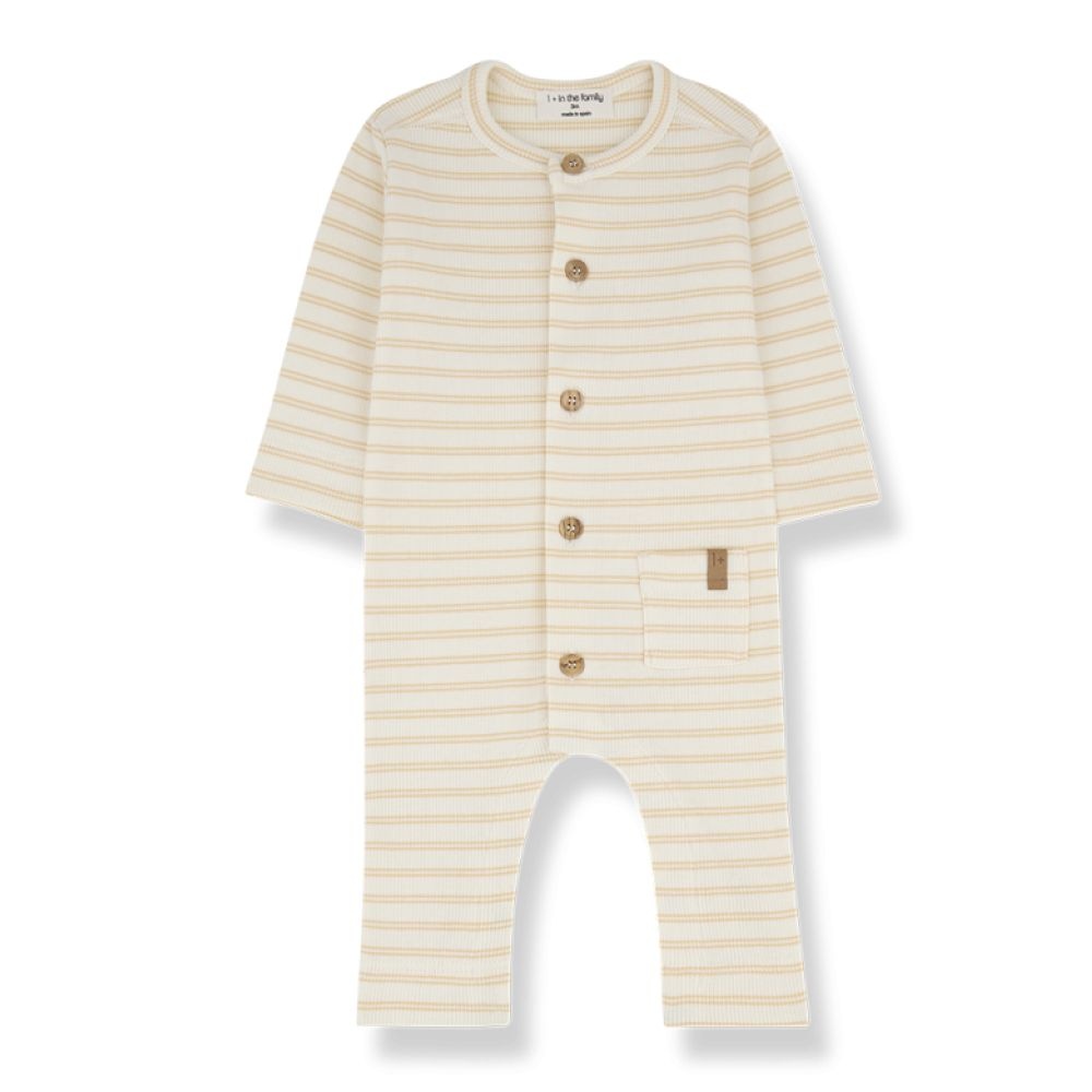 De Sander Jumpsuit Peach is een comfortabel boxpakje, ideaal als eerste pakje voor je newborn baby. Dit pakje is gemaakt van 95% katoen en 5% elastaan, wat zorgt voor een zachte en rekbare pasvorm. Het subtiele streeppatroon in warm geel/creme geeft een stijlvolle uitstraling. Dankzij de handige drukknoopjes bij de beentjes is het pakje eenvoudig aan en uit te trekken, perfect voor dagelijks gemak. Het kleine zakje op de voorkant voegt een speels detail toe.