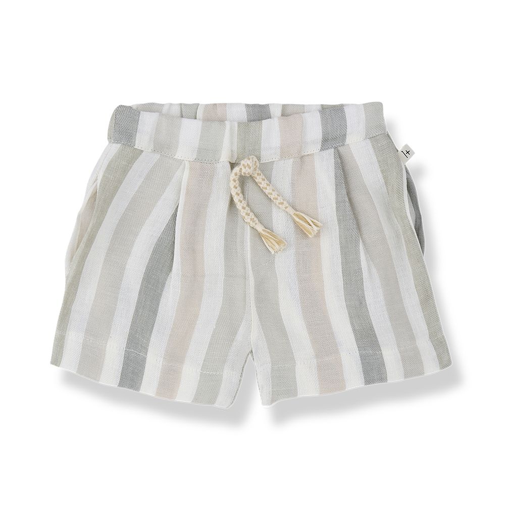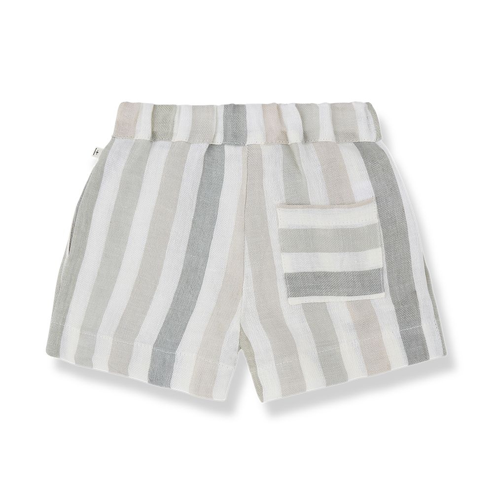 Deze korte broek van 1+ in the family is uitgevoerd in een zachte streep in rustige tinten off-white, beige en vergrijsd groen. De short is gemaakt van licht en ademend katoen en voelt prettig aan op de gevoelige babyhuid. Dankzij de elastische tailleband met decoratief koord zit de korte broek comfortabel en blijft hij goed op zijn plek tijdens bewegen en spelen. De relaxte pasvorm maakt dit broekje ideaal voor dagelijks gebruik en makkelijk te combineren met een shirt, romper of licht sweater.