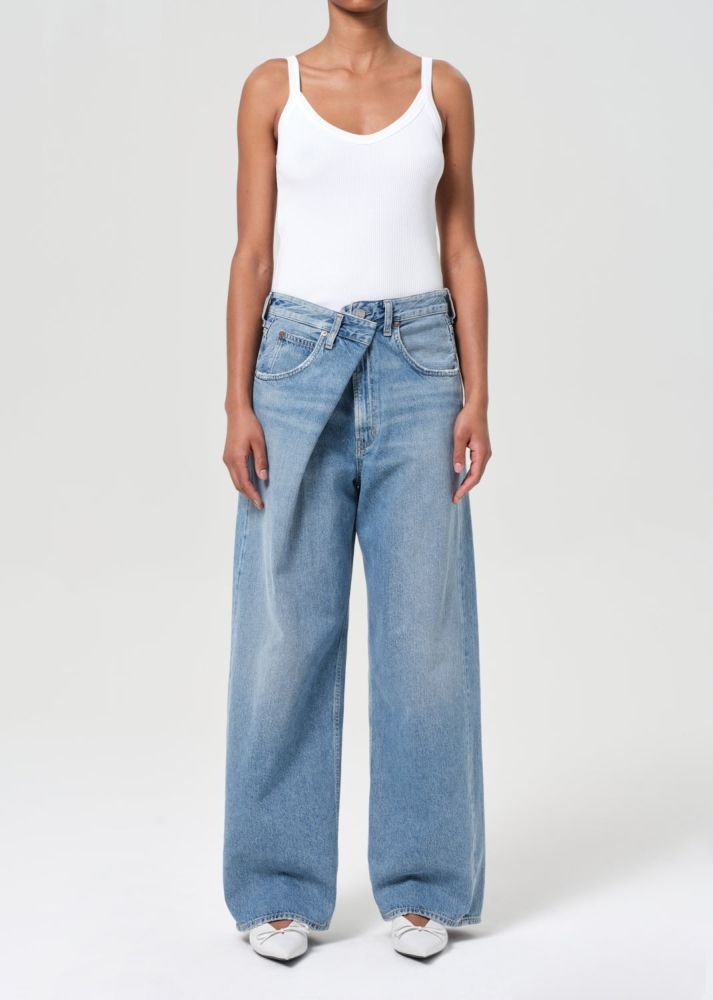 De Vana Fold Jean van AGOLDE heeft een uitgesproken silhouet met een hoge taille en extra wijde pijpen. De karakteristieke gevouwen tailleband geeft deze jeans een vernieuwende, modieuze uitstraling en zorgt voor een subtiele twist binnen het klassieke denimdesign. De Mantra-wassing is uitgevoerd in een lichtblauwe denimkleur met een zachte, vintage look die makkelijk te combineren is.