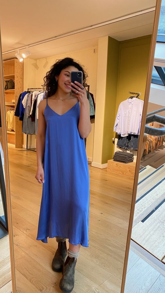 Deze blauwe jurk van American Vintage heeft een elegante, minimalistische uitstraling en valt soepel langs het lichaam. De lange jurk is uitgevoerd met smalle schouderbandjes en een zachte V-hals, wat zorgt voor een verfijnde en vrouwelijke look. De lichte, gladde stof voelt prettig aan op de huid en beweegt mooi mee tijdens het dragen. De heldere blauwe kleur geeft deze dress een frisse uitstraling en maakt combineren eenvoudig, zowel casual als iets gekleder. Een tijdloze jurk die past bij de ontspannen en stijlvolle signatuur van American Vintage.