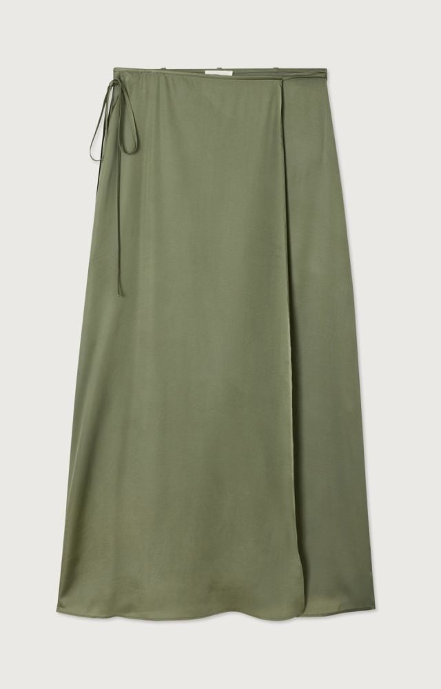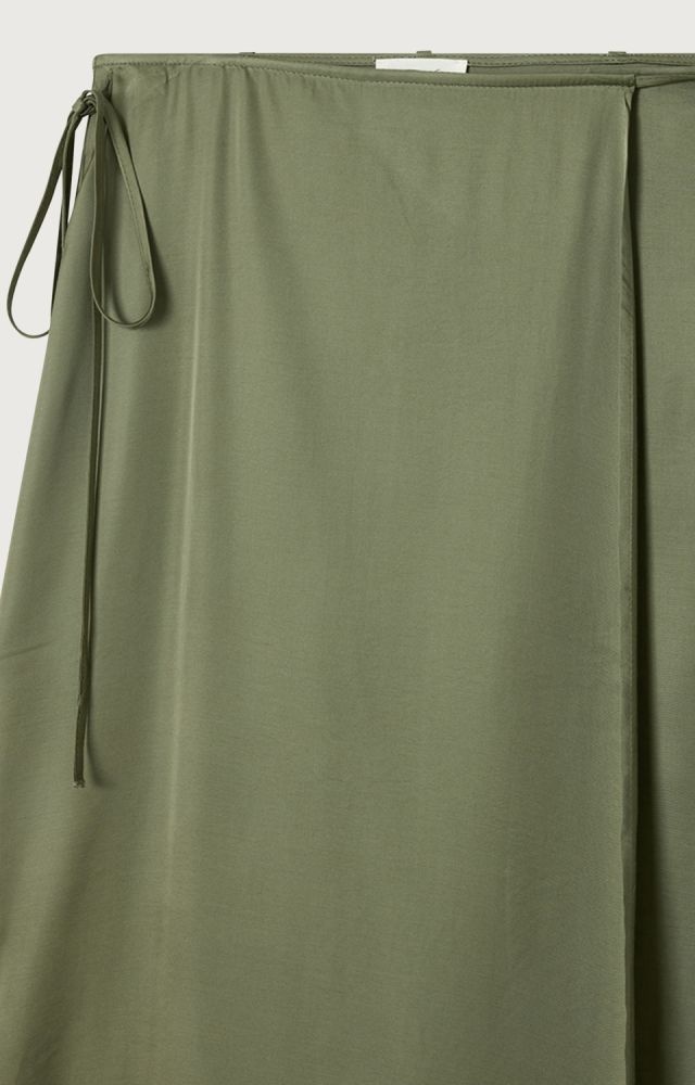 Deze olijfgroene rok van American Vintage heeft een elegante, rustige uitstraling en valt mooi soepel om het lichaam. De lange rok is uitgevoerd als wikkelrok en sluit aan de zijkant met een striksluiting, wat zorgt voor een verfijnd detail en een verstelbare pasvorm. De stof voelt licht en glad aan en beweegt prettig mee tijdens het dragen. De zachte groene tint geeft deze rok een tijdloze look en maakt combineren met een t-shirt, top of blouse eenvoudig. Ook leuk te combineren met de bijpassende top uit de collectie. Een vrouwelijke rok met het minimalistische karakter dat past bij American Vintage.