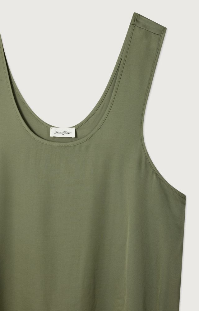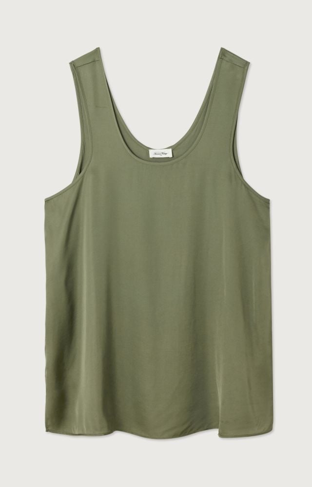 Deze olijfgroene mouwloze top van American Vintage heeft een rustige, minimalistische uitstraling en draagt heerlijk licht. De top zonder mouwen is gemaakt van een soepel vallende stof die prettig aanvoelt op de huid en mooi meebeweegt. De ronde hals en de losse vorm geven deze tanktop een ontspannen look, passend bij de herkenbare stijl van American Vintage. De zachte groene kleur laat zich eenvoudig combineren met een broek, rok of short en is geschikt om los te dragen of als laagje. Ook leuk te combineren met de bijpassende rok uit de collectie. Een tijdloze basic top voor elke dag.