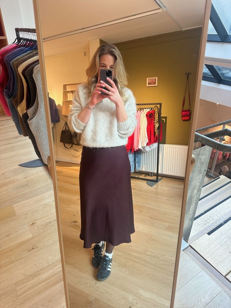 De Niby trui van American Vintage is een zachte, gebreide damestrui in de kleur Polar Melange. Met zijn licht gemêleerde uitstraling en iets cropped pasvorm biedt deze trui een moderne look en een comfortabele fit. Gemaakt van een luxueuze mix met alpaca en wol, voelt hij warm en licht aan. Perfect te dragen op zowel jeans als een rok, voor een stijlvolle en cozy outfit.