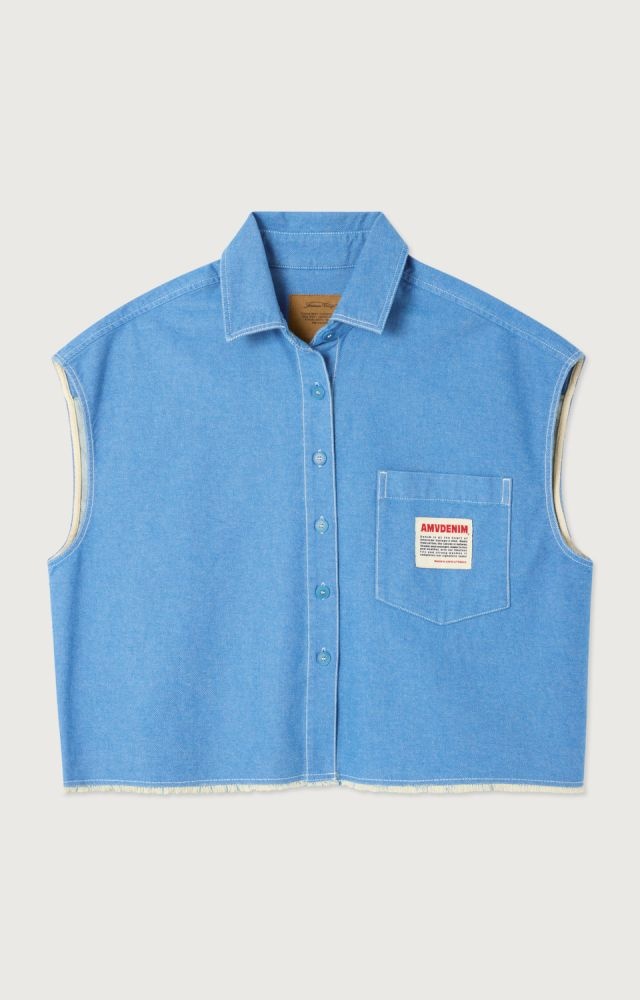 Deze mouwloze denim blouse van American Vintage heeft een stoere en eigentijdse uitstraling. De overhemd blouse is gemaakt van een stevige maar soepele denimstof en voelt comfortabel aan tijdens het dragen. De knoopsluiting en klassieke kraag geven deze blouse een tijdloos karakter, terwijl de onafgewerkte randen zorgen voor een nonchalante touch. Op de borst zit een opgestikte zak met een subtiel AMV Denim label, wat het ontwerp extra karakter geeft. De blauwe kleur maakt deze top makkelijk te combineren met een broek, rok of over een t-shirt. Een veelzijdige blouse en top met de herkenbare American Vintage look.