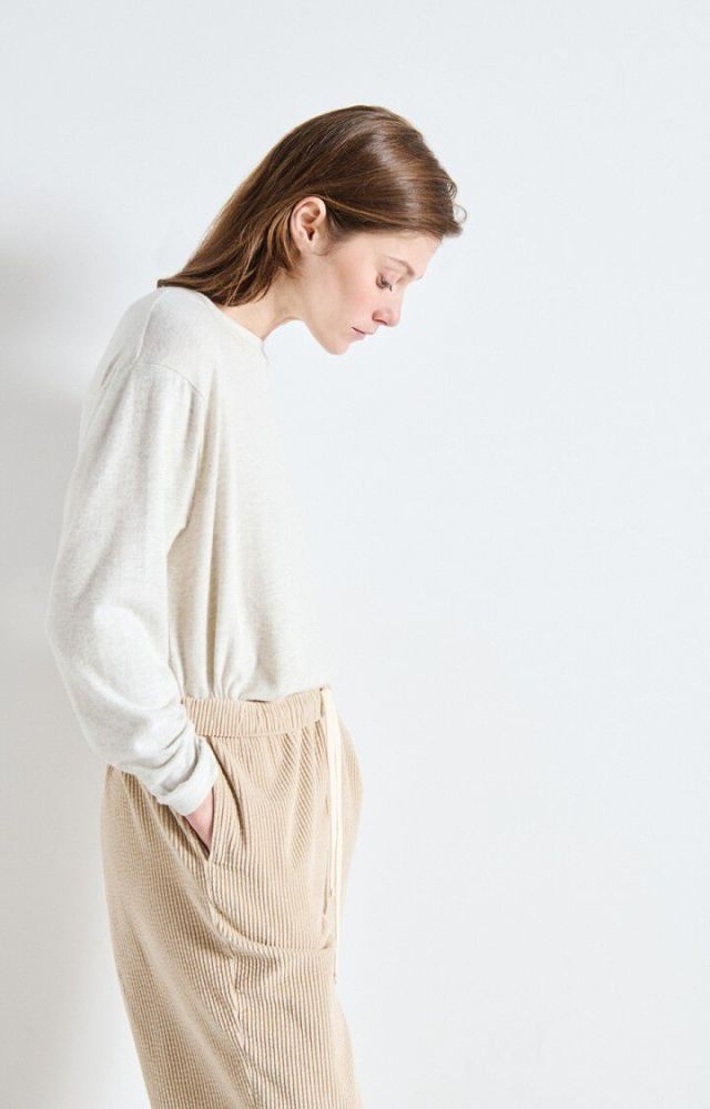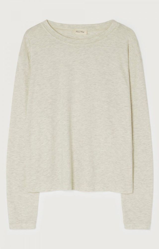 Deze lichte, gemêleerde longsleeve van American Vintage is zo’n item dat je het liefst elke dag uit de kast trekt. De top heeft een relaxed fit met verlaagde schoudernaden en een zachte, soepele stof die heerlijk meebeweegt. De subtiele gemêleerde kleur geeft een rustige, frisse uitstraling en maakt het shirt makkelijk te combineren met al je favoriete items.