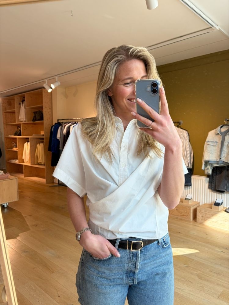Deze witte overhemd blouse van Bellerose heeft een frisse, tijdloze uitstraling dankzij de korte mouwen en de striksluiting aan de voorkant. De lichte stof valt soepel en maakt dat het luchtig aanvoelt. De strik geeft de blouse een speels accent en maakt het silhouet net wat verfijnder. Mooi te combineren met een linnen broek, een denim short of een wijde pantalon voor een relaxed maar stijlvol geheel.