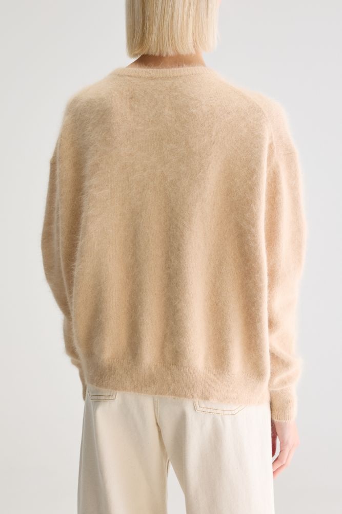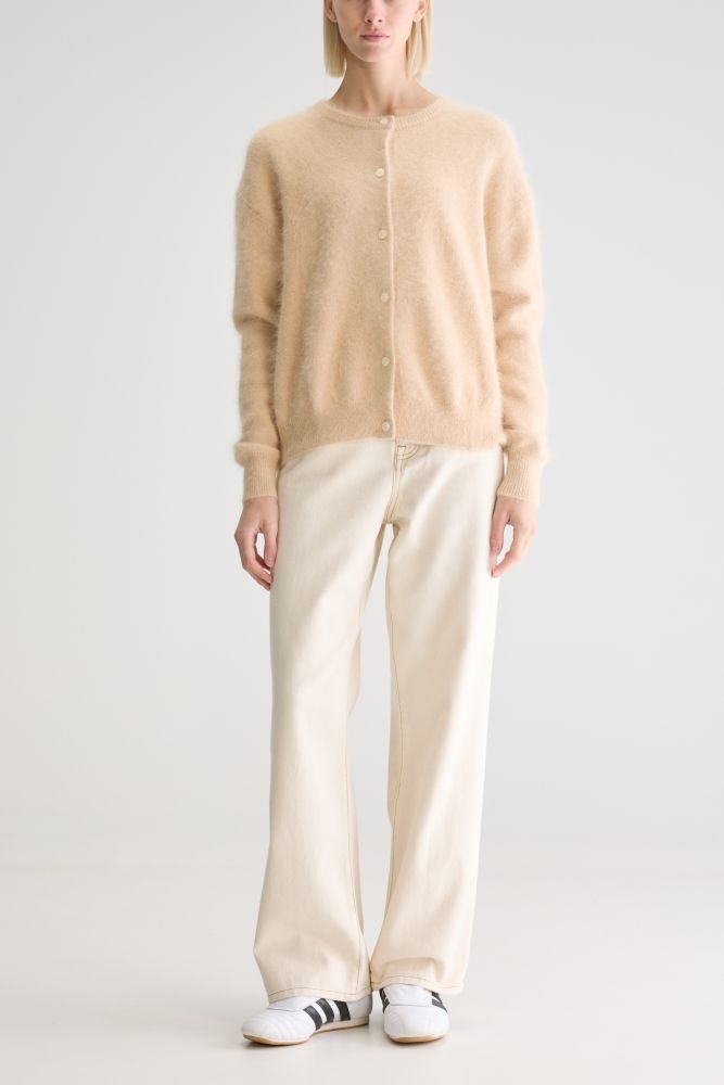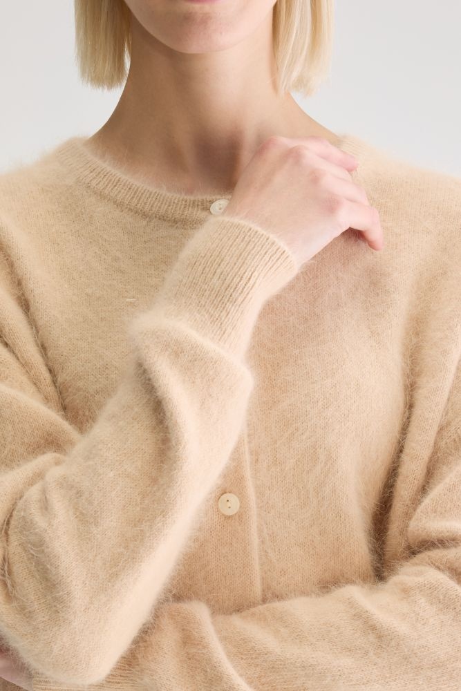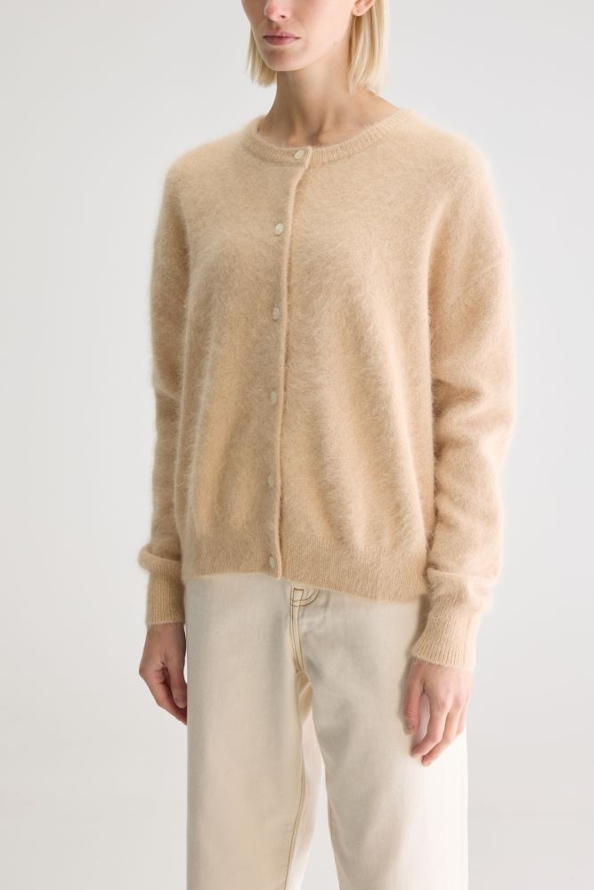 Deze zachte beige cardigan van Bellerose is een verfijnde aanvulling op je garderobe. De combinatie van 65% angora en 35% polyamide zorgt voor een lichtgewicht, luchtige en heerlijk zachte textuur. Het rechte silhouet met ronde hals en fijne knoopsluiting geeft de trui een tijdloze uitstraling. Perfect als los vestje over een blouse of als zachte knitwear-top op zichzelf gedragen. De subtiele beige kleur maakt het makkelijk te combineren.