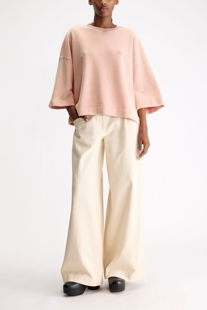 Deze zachte, roze sweatshirt van Bellerose heeft een ontspannen, boxy pasvorm met extra wijde halve mouwen voor een moderne, luchtige look. De subtiele kleur en het kleine geborduurde detail voorop maken het een fijne basic die je makkelijk combineert met een jeans, een rok of een wijde broek. Comfortabel, stijlvol en perfect voor everyday outfits.