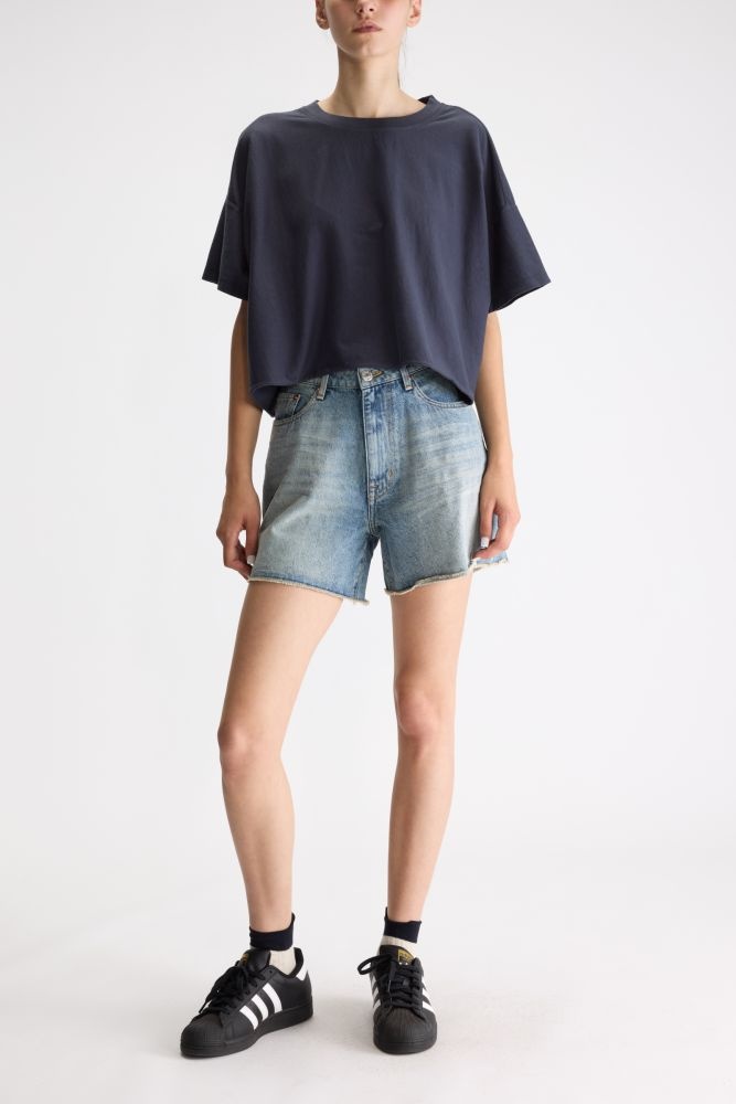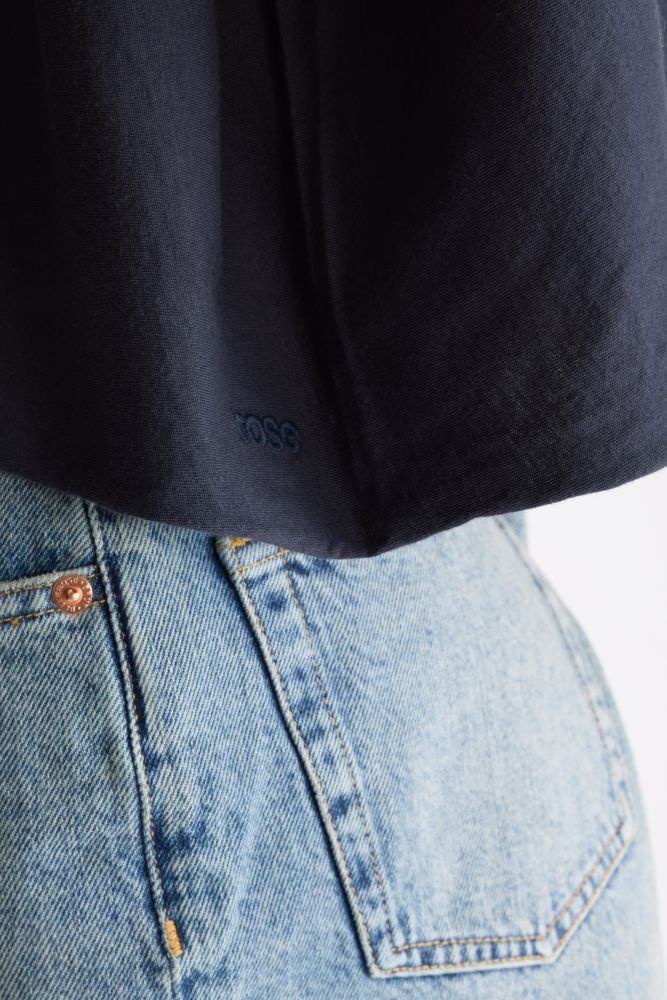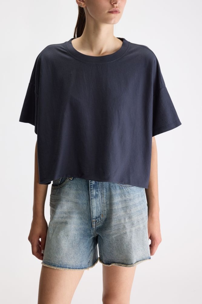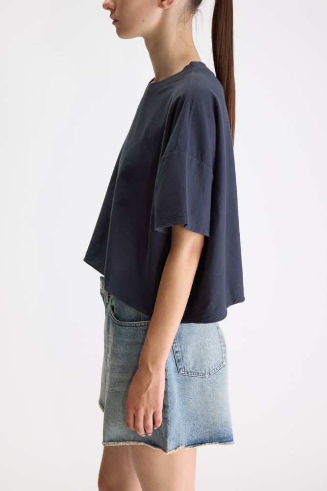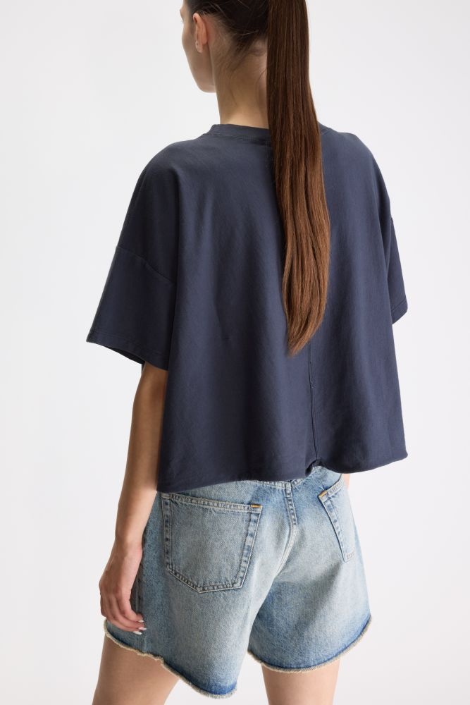 Deze loose-fit t-shirt van Bellerose heeft een donkerblauwe kleur en een ontspannen, boxy silhouet dat soepel om het lichaam valt. De verlaagde schoudernaden en de iets kortere lengte geven het ontwerp een moderne, nonchalante uitstraling. Je combineert je deze top moeiteloos met jeans, shorts of een nette broek. Een fijne basic voor een rustige, tijdloze look.