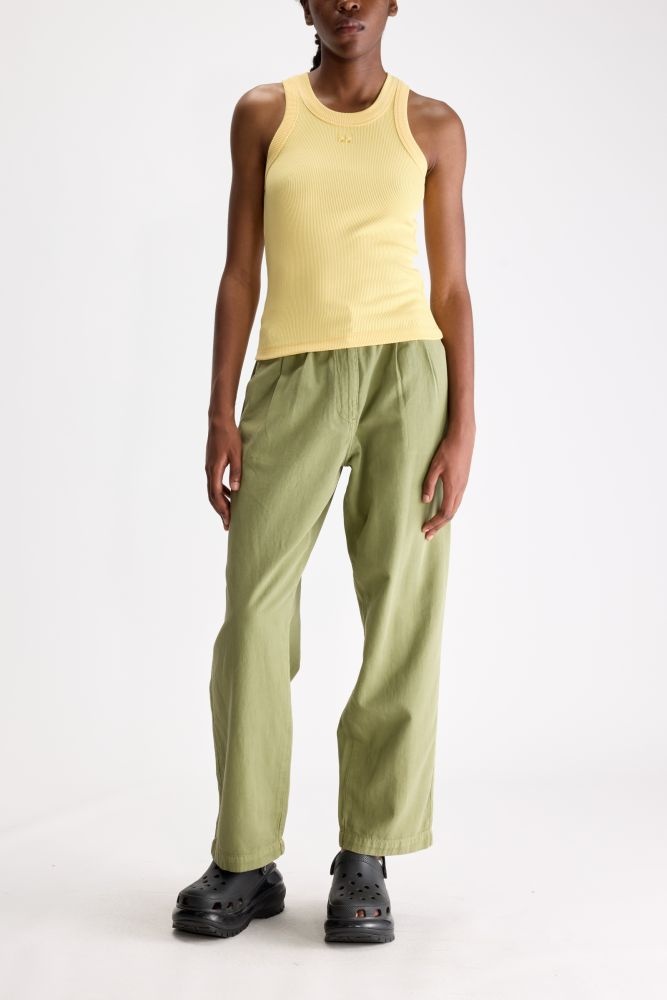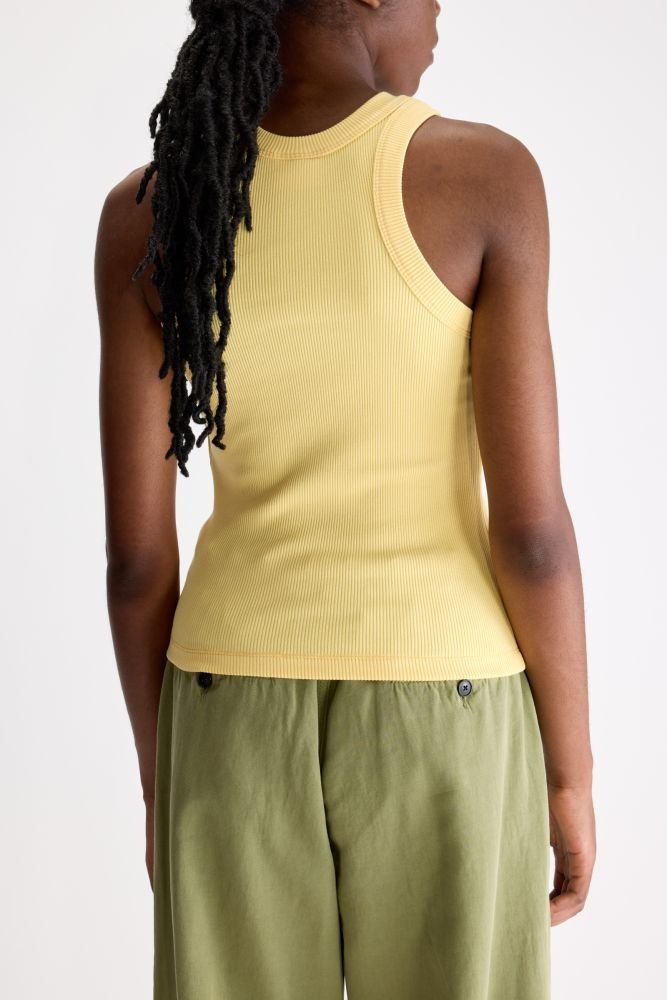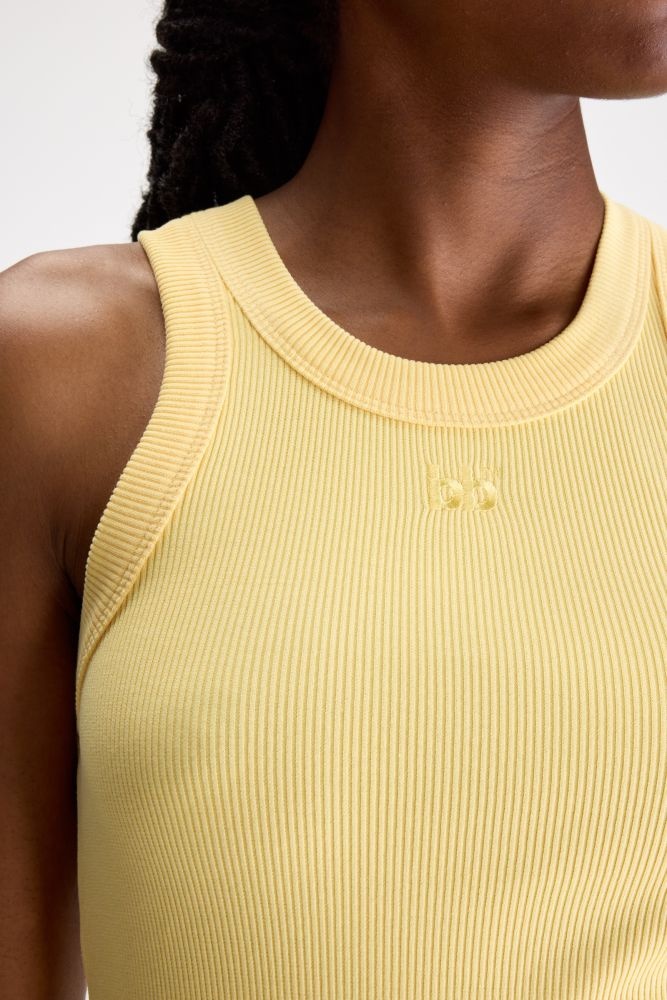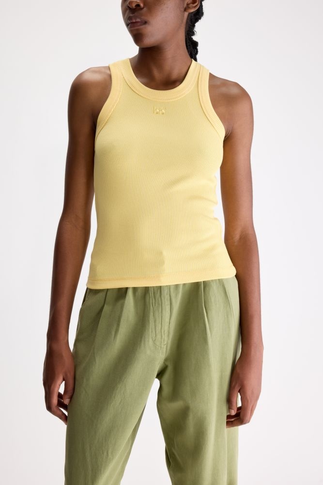 Deze ribgebreide top van Bellerose heeft een frisse gele kleur en sluit mooi aan op het lichaam. De ronde hals en brede schouderbanden geven het ontwerp een sportieve, vrouwelijke uitstraling. Dankzij de aangesloten pasvorm combineer je deze tanktop moeiteloos met zowel casual broeken als luchtige rokken. Een fijne basic die elke outfit een zonnige, rustige noot geeft.