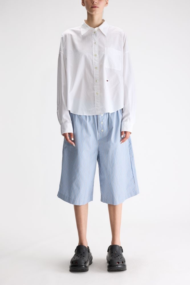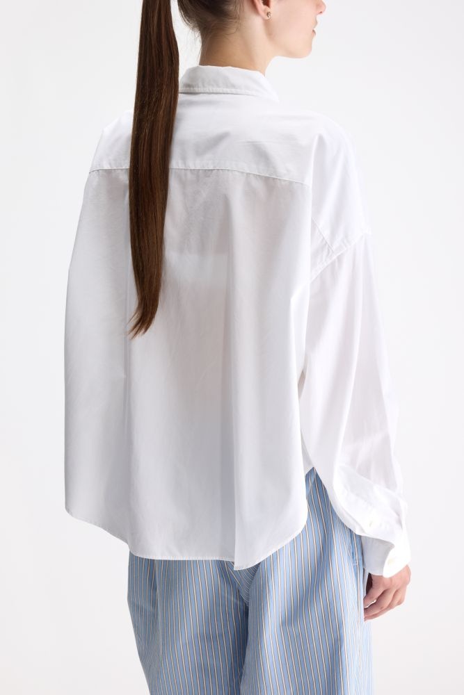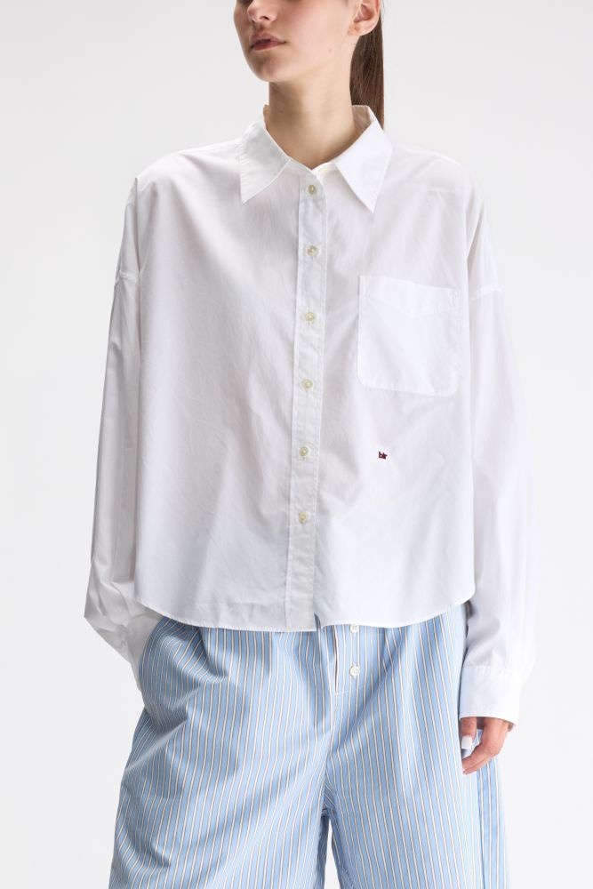 Deze witte blouse van Bellerose is een tijdloze basic met een relaxed, licht oversized silhouet. Gemaakt van luchtige katoen valt dit overhemd soepel en voelt het extra comfortabel aan. De voorkant heeft een borstzakje en subtiel geborduurd detail, wat de blouse net wat speelser maakt. Dankzij de rechte, kortere lengte combineer je deze top moeiteloos met shorts, denim of een losvallende broek voor een frisse, moderne look. Perfect voor elke dag – van school tot vakantie.