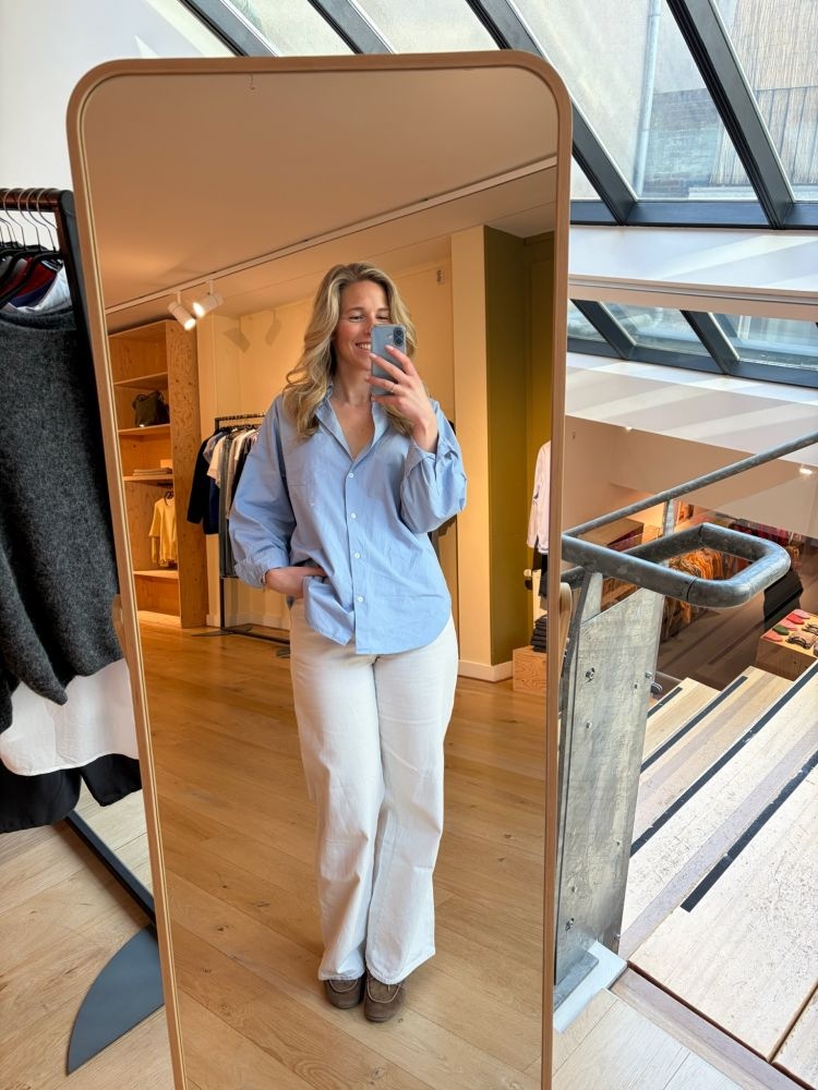 Deze lichtblauwe overhemd blouse is een tijdloze klassieker in een moderne pasvorm. Het model heeft verlaagde schoudernaden, een rechte snit en ballonmouwen met manchetten, wat zorgt voor een ontspannen maar verzorgde uitstraling. Gemaakt van 100% katoen voor een ademend en stevig draagcomfort. De borstzak en klassieke kraag geven de blouse een verfijnde touch.