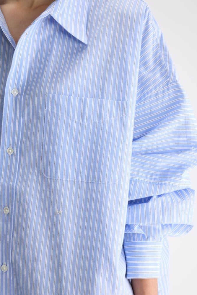 Deze luchtige blousejurk van Bellerose komt in een lichtblauwe streep en is gemaakt van soepel katoen voor een comfortabele, zomerse fit. Het ruimvallende silhouet, de klassieke kraag en de volledige knoopsluiting geven de blauwe jurk een tijdloze, ontspannen uitstraling. Dankzij de rechte lengte en verlaagde schoudernaden draagt de blousejurk heerlijk nonchalant. Combineer met sandalen, sneakers of loafers voor een frisse, moeiteloze look die de hele dag door werkt.