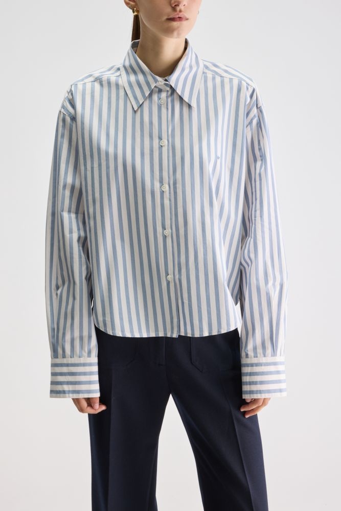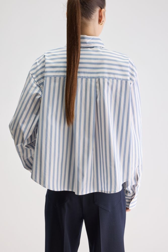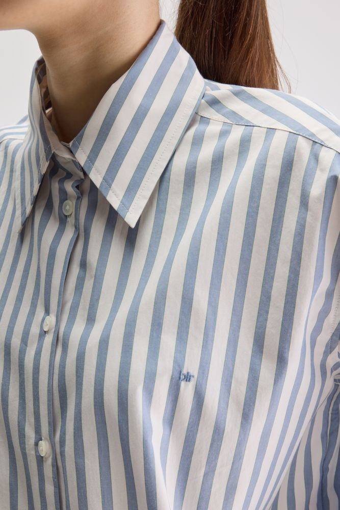 Deze gestreepte overhemd blouse heeft een frisse, blauwe en witte streep die meteen een cleane, tijdloze look geeft. De iets ruimere pasvorm en de langere manchetten zorgen voor een moderne twist, terwijl de klassieke kraag het geheel verfijnd houdt. Je draagt deze blouse moeiteloos op een chino, een wijde pantalon of een jeans voor een ontspannen maar verzorgde outfit. Ideaal voor zowel werkdagen als casual momenten waarop je nét iets meer stijl wilt.