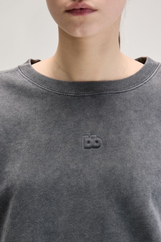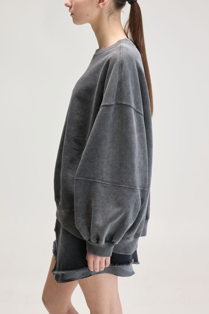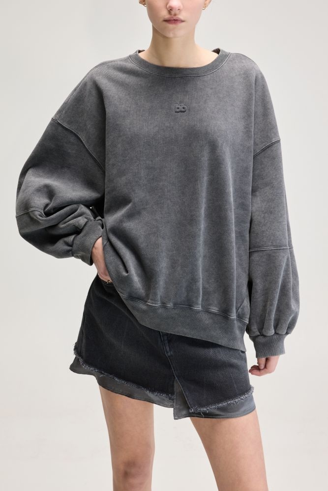 Deze vergrijsd zwarte sweater combineert een relaxte pasvorm met een stoere, gewassen look. Het oversized silhouet met dropped shoulders en ballonmouwen geeft een eigentijdse twist aan deze comfortabele basic. De trui is afgewerkt met een subtiel geborduurd logo op de borst en stevige ribboorden aan de mouwen en zoom. De stevige katoenen stof voelt zacht aan en biedt comfort voor elke dag.