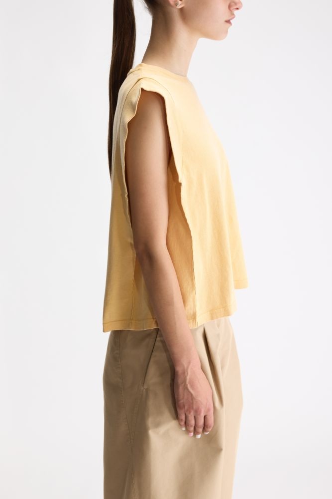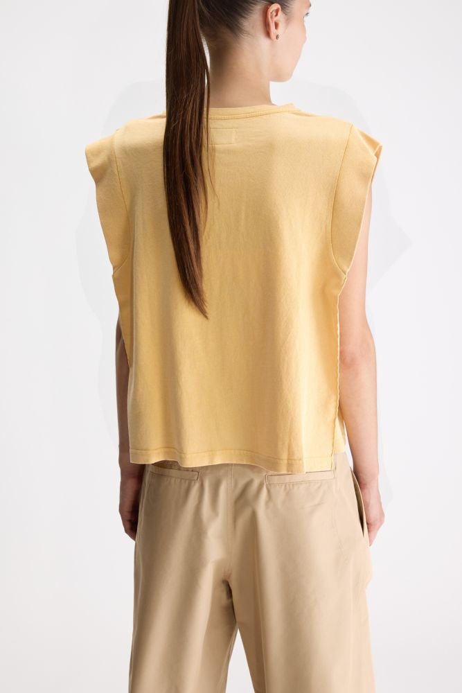Dit mouwloze shirt van Bellerose heeft een zachte, gele tint die meteen een frisse en rustige uitstraling geeft. Het rechte, iets boxy silhouet valt losjes langs het lichaam en zorgt voor een relaxed maar verzorgd effect. De verbrede schouderlijn geeft het ontwerp een moderne twist en laat het shirt mooi aansluiten bij zowel wijde broeken als strakkere silhouetten. Een veelzijdig geel topje dat moeiteloos combineert en een subtiel, vrouwelijk accent toevoegt aan iedere outfit.