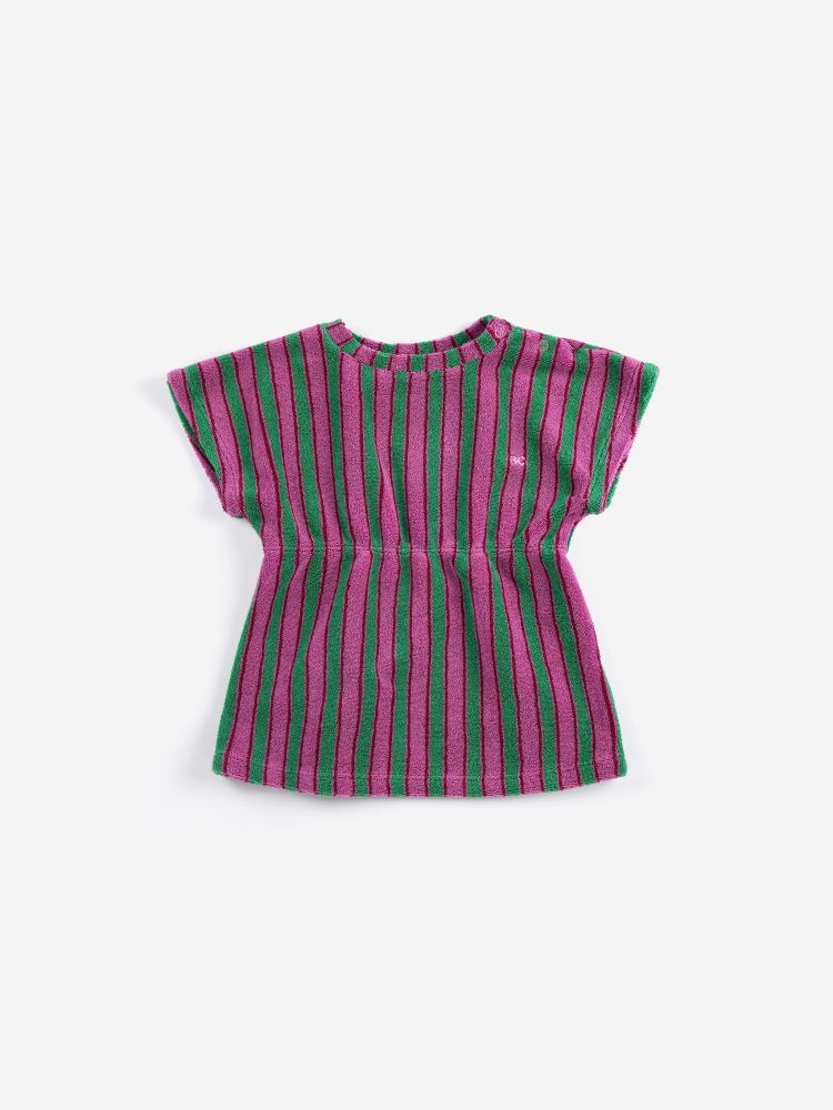 Dit jurkje van Bobo Choses is gemaakt van zachte badstof en heeft een speels gestreept patroon. De strepen in paars en groen geven het jurkje een frisse, grafische uitstraling. De korte mouwen en de licht getailleerde pasvorm zorgen voor een comfortabel silhouet dat prettig draagt tijdens het spelen. Door de badstofkwaliteit voelt de stof zacht aan op de huid en is de jurk praktisch in gebruik. Een fijn zomeritem dat makkelijk te combineren is.