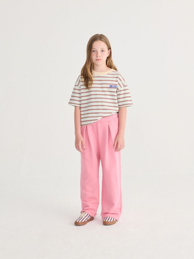 Deze gestreepte t-shirt van Bobo Choses is een fijne en comfortabele toevoeging aan de garderobe van kinderen. De top met korte mouwen heeft een zachte lichtblauwe basis met smalle horizontale strepen in een warme bordeaux rode tint, wat zorgt voor een speelse maar rustige uitstraling. Het tshirt is gemaakt van zacht katoen en voelt prettig aan op de huid, ideaal voor dagelijks dragen. De ronde hals met contrasterende boord en het subtiele Bobo Choses-logo op de borst geven dit blauwe shirt een herkenbare en eigenzinnige touch. Mooi te combineren met een short of broek.