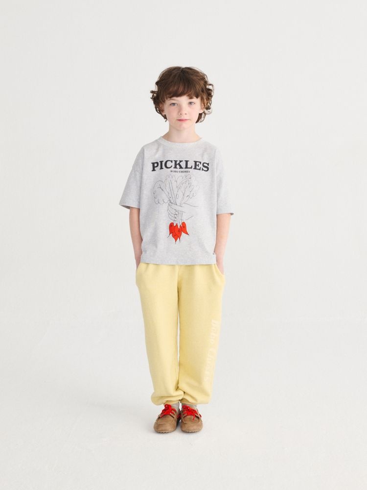 Dit Bobo Choses t-shirt heeft een ontspannen pasvorm en is uitgevoerd in een zachte grijze kleur. Op de voorkant staat een herkenbare Pickles-print met een handgetekende illustratie en subtiele kleuraccenten, wat zorgt voor een speelse uitstraling. Het shirt heeft korte mouwen en een ronde hals en draagt comfortabel als dagelijkse top. Een makkelijk te combineren item binnen de garderobe van kinderen.