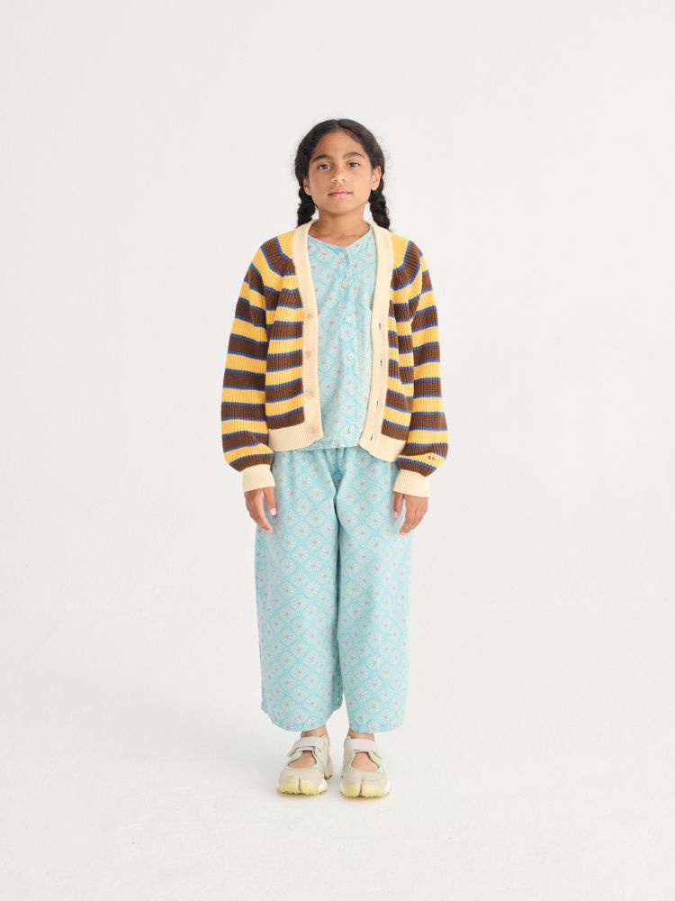 Deze broek van Bobo Choses is een culotte met een wijde, losvallende pasvorm en rechte pijpen. De culotte broek valt soepel en draagt comfortabel, ideaal voor dagelijks gebruik. Het ontwerp is uitgevoerd in lichtblauw met een verfijnde all-over print in zachte, neutrale tinten, wat de broek makkelijk combineerbaar maakt. De elastische tailleband zorgt voor een prettige fit en extra draaggemak.
