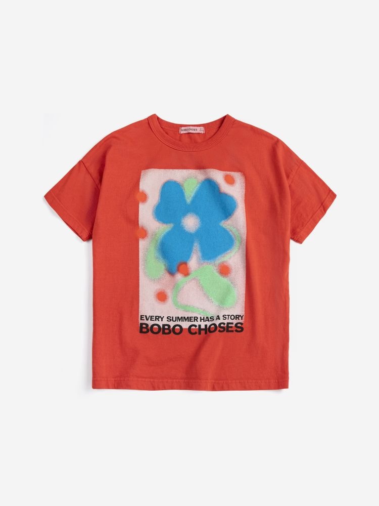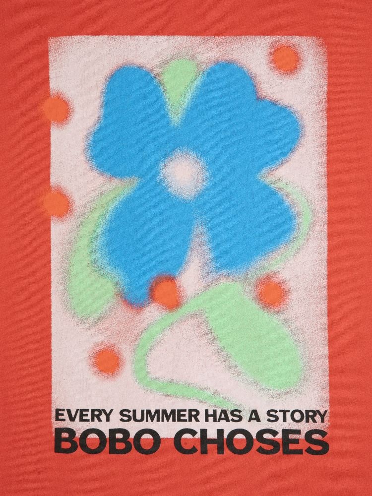 Deze t-shirt van Bobo Choses valt op door de warme rode kleur en de speelse grafische print op de voorkant. Het tshirt is uitgevoerd met een grote bloemillustratie in blauw, groen en zachte tinten, gecombineerd met de tekst “Every summer has a story – Bobo Choses”. De top met korte mouwen heeft een rechte, comfortabele pasvorm en een ronde hals, waardoor hij fijn zit voor dagelijks dragen. Dit shirt is makkelijk te combineren met een short of broek en past goed bij een ontspannen stijl.