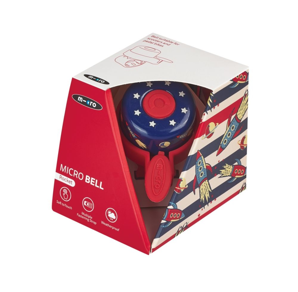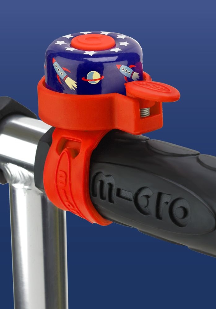 Met de bel op jouw step, laat je veilig en snel horen dat je er aan komt. Gemakkelijk te bevestigen op het stuur van de Microsteps. Deze bel komt in een blauwe kleur met een print van raketten.