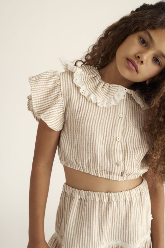 De Cozmo Jana top, gemaakt van 100% katoen, straalt een speelse charme uit. Deze luchtige top heeft een subtiele streepprint en is afgewerkt met een Peter Pan kraag met kanten details voor een vleugje romantiek. De korte mouwen zijn licht gerimpeld voor een extra vrouwelijke touch, en de knoopsluiting aan de voorkant maakt het makkelijk om aan te trekken. Perfect te combineren met een rok of short voor een zomerse look.