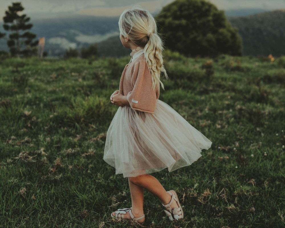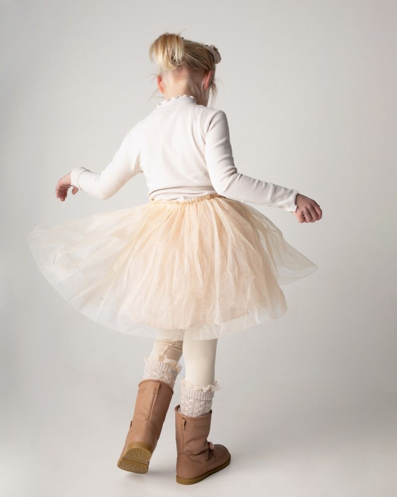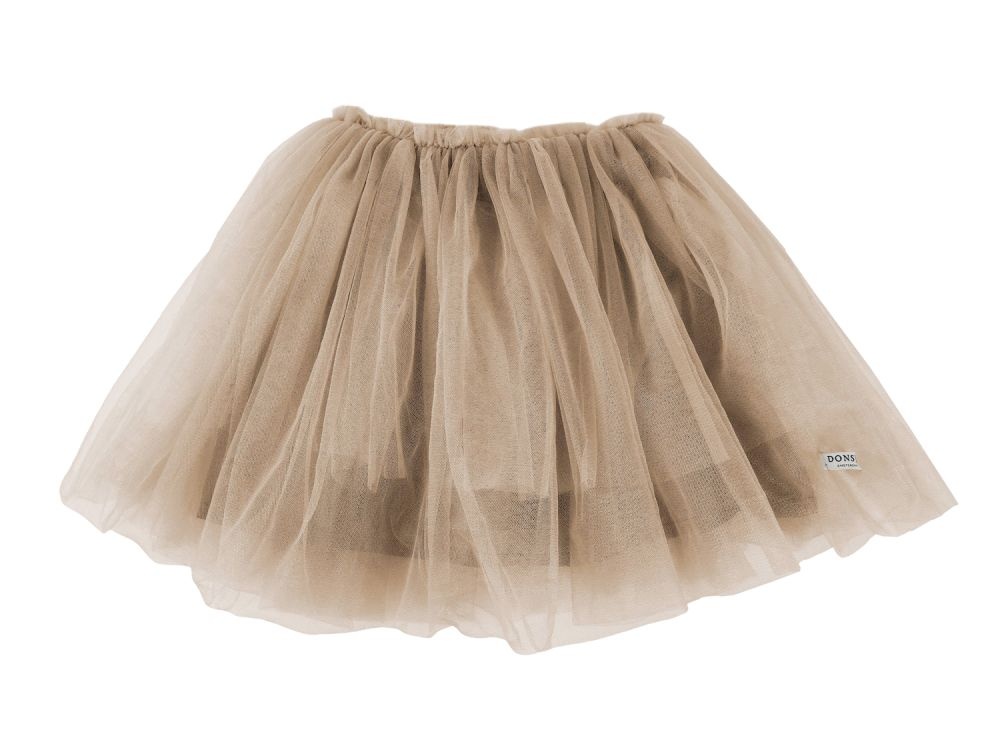Tutu rok van Donsje Amsterdam in een glimmende licht bruine kleur. Het perfecte tule rokje voor feestelijke gelegenheden. Met katoenen onderrok en elastische tailleband.