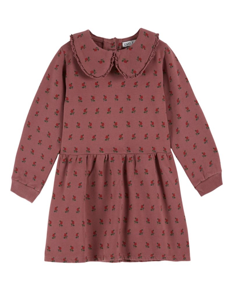 Deze fleece jurk van Emile et Ida is zowel comfortabel als stijlvol. De poppy print in rood en groen op een bruine ondergrond geeft een zachte, romantische uitstraling. De sweat jurk is gemaakt van 100% biologisch katoen fleece en heeft lange mouwen met geribde boorden, een uitlopend rokgedeelte en een ronde peterpan kraag met subtiel ruffle-detail.