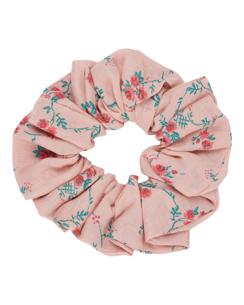 Deze vrolijke scrunchy van Emile et Ida is gemaakt van 100% katoen en heeft een zachte roze ondergrond met een speelse bloemenprint in rood en groen. Dankzij het zachte materiaal zit de scrunchy comfortabel in het haar en is hij perfect voor nonchalante kapsels zoals een knot of staart. Een charmant accessoire dat kleur en zachtheid toevoegt aan elke outfit. Geschikt voor het haar of als armband.