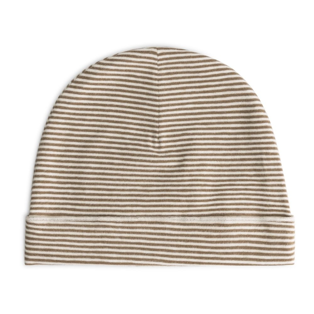 Deze zachte baby muts van Gray Label is een onmisbaar item voor de eerste maanden. Gemaakt van GOTS-gecertificeerd biologisch katoen met een subtiele streep in Woody bruin en Cream. De lichte stretch zorgt voor een comfortabele pasvorm die mooi aansluit zonder te knellen.