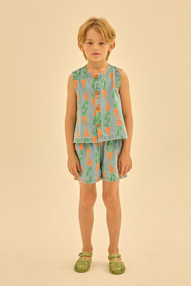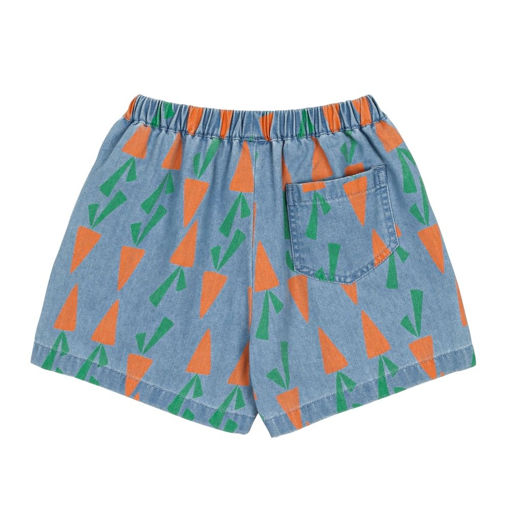 Deze Jelly Mallow korte broek is gemaakt van 100% katoen en combineert een speels design met comfort. De denimblauwe basis wordt opgefleurd door een vrolijke wortelprint in oranje en groen, wat de broek een unieke uitstraling geeft. De elastische tailleband zorgt voor een comfortabele pasvorm, ideaal voor actieve dagen. Perfect te combineren met een simpel t-shirt of top voor een kleurrijke en zomerse look. Deze korte broek voegt een frisse en speelse touch toe aan elke garderobe.