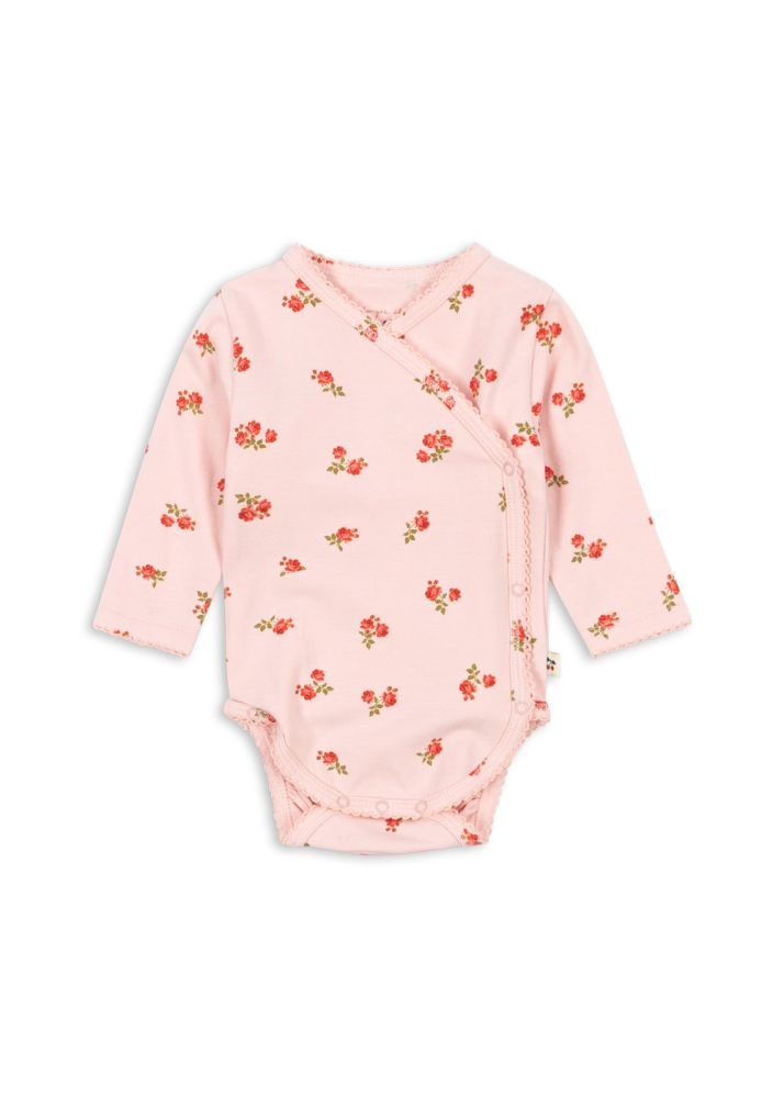 Deze zachte overslagromper van Konges Sloejd is een fijn rompertje voor de allerkleinsten. De lichtroze romper is bedrukt met een lieve bloemenprint en heeft een praktische overslag sluiting met drukknoopjes aan de zijkant en onderkant, ideaal voor makkelijk aan- en uitkleden. Gemaakt van zacht en ademend katoen dat comfortabel aanvoelt op de gevoelige babyhuid. Perfect voor dagelijks gebruik of als laagje onder een truitje of slaapzak.