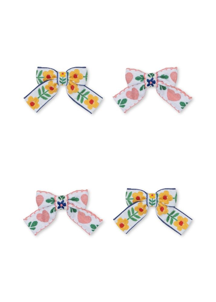 Hoe leuk is deze set van vier haarklipjes? De strikjes zijn voorzien van kleurige bloemen- en hartjesprints in de kleuren roze, blauw, groen en geel. Een echte toevoeging aan je outfit.