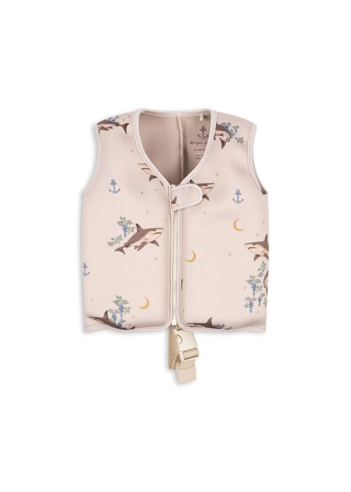 Dit stijlvolle zwemvest in een zachte beige tint met een leuke haaienprint is perfect voor kindjes die het water willen verkennen. Het zwemvest biedt extra drijfvermogen en zorgt ervoor dat je kindje zich zelfverzekerd voelt tijdens het leren zwemmen. Voorzien van uitneembare schuimblokken, zodat het vest kan worden aangepast aan de behoeften van je kind. Het ontwerp is praktisch met een stevige rits aan de voorkant en een verstelbare gesp aan de onderzijde voor een veilige pasvorm. Draag het zwemvest over je zwempak of zwembroek en je bent klaar voor een plons in het water!