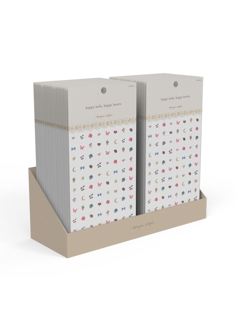 Deze speelse nagelstickers voor kinderen maken van ieder nagelsetje een vrolijk kunstwerk. De set bevat drie vellen met kleine, kleurrijke ontwerpen zoals bloemen, strikjes, hartjes, maantjes en zonnetjes. De stickers zijn eenvoudig aan te brengen en te verwijderen, waardoor ze ideaal zijn voor creatieve momenten zonder rommel of nagellak. Perfect voor feestjes, speelafspraken of gewoon om een gewone dag op te vrolijken. Met het motto ‘happy nails, happy hearts’ brengen deze nagelstickers een glimlach bij elk kind.