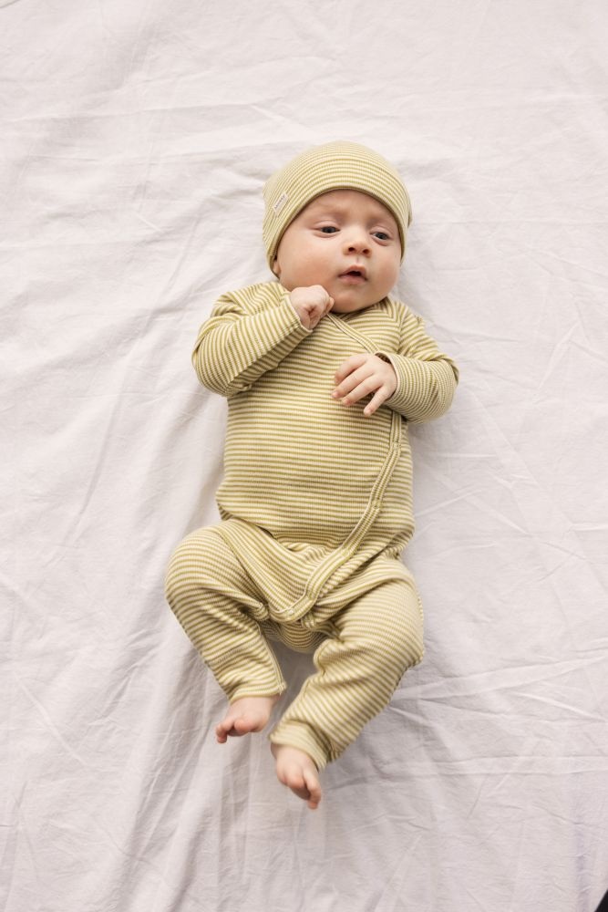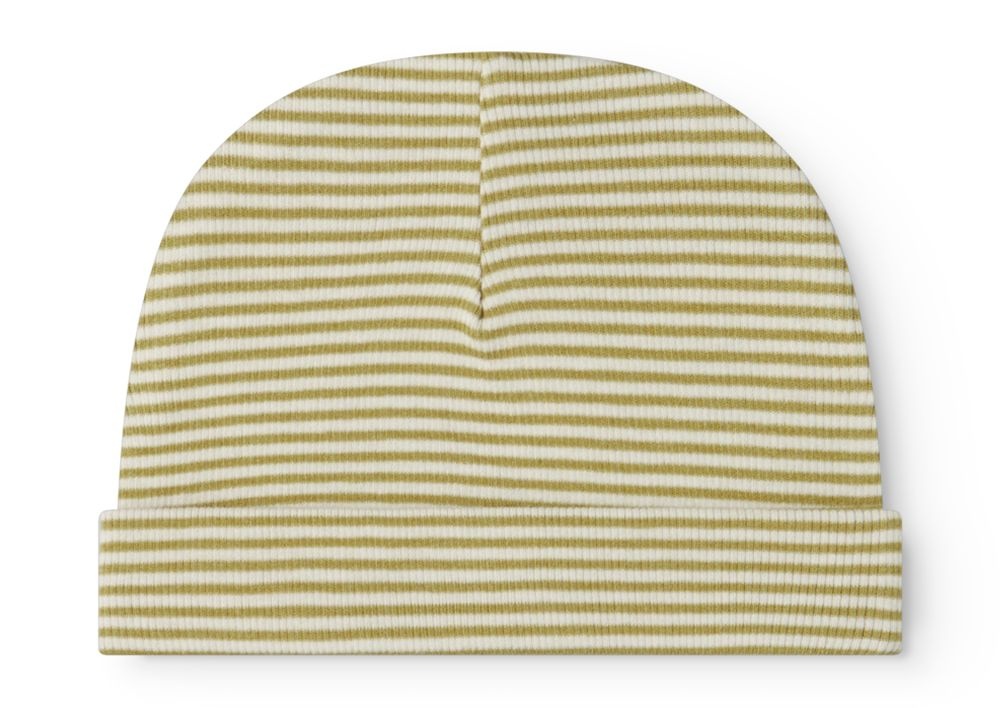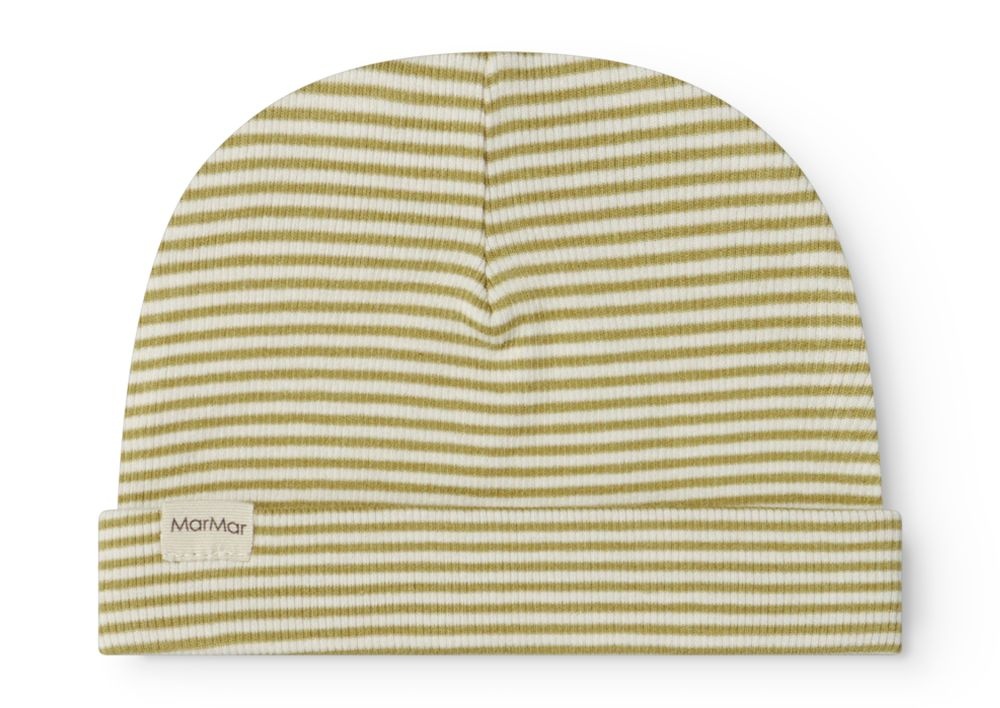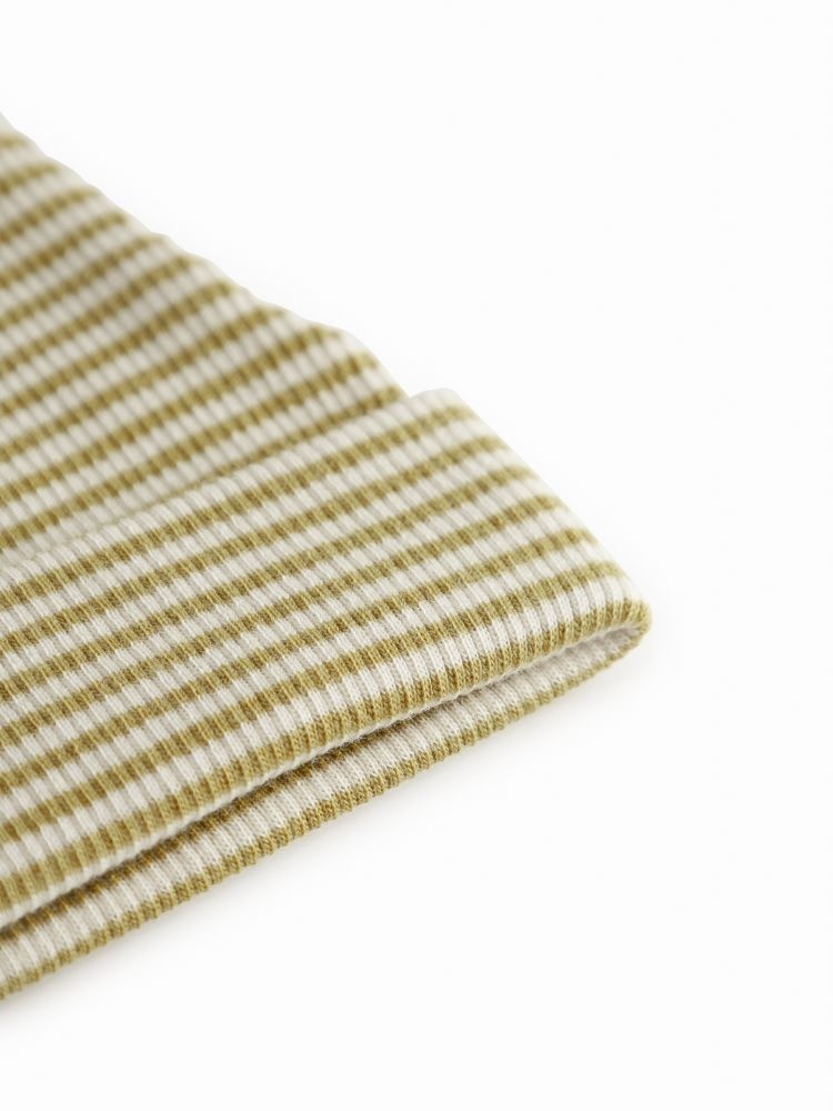 Dit MarMar mutsje heeft een fijne ribstructuur met smalle strepen in groen en crème. De omgeslagen rand zorgt voor een comfortabele pasvorm en een rustige, tijdloze uitstraling. Het subtiele MarMar-label aan de voorkant geeft het mutsje een herkenbare afwerking. Deze babymuts is makkelijk te combineren met bijpassende rompers, broekjes of boxpakjes uit dezelfde kleurenlijn. Geschikt voor dagelijks gebruik en ideaal om het hoofdje van je baby warm te houden, zonder overheersend te zijn.