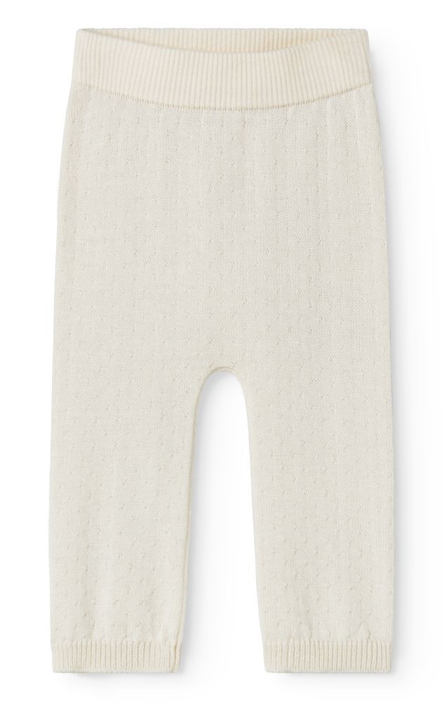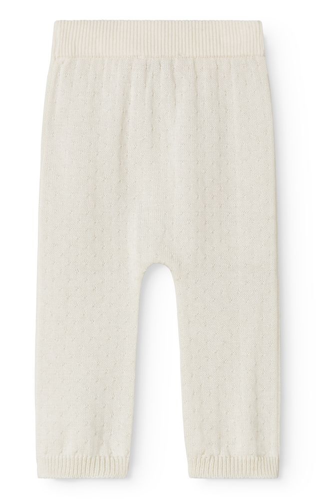 Deze MarMar broek is uitgevoerd in een zachte, fijngebreide stof in een witte tint. De subtiele structuur in het breisel geeft de broek een rustige, verfijnde uitstraling. De elastische tailleband zorgt voor een comfortabele pasvorm en maakt het broekje makkelijk aan en uit te trekken. Dankzij de lange pijpen en het soepele materiaal beweegt de broek prettig mee, ideaal voor dagelijks gebruik. Mooi te combineren met een bijpassend vestje uit de MarMar-collectie voor een complete set.