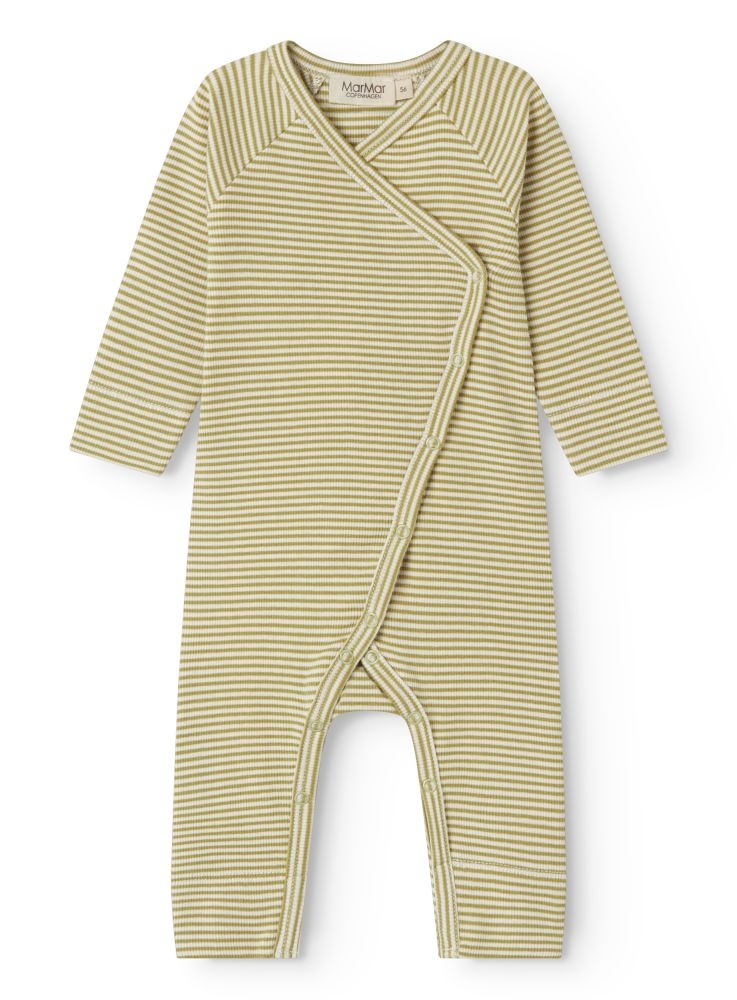 Dit MarMar boxpakje is gemaakt van een zachte ribstof met fijne strepen in olijfgroen en crème. Het overslagmodel met drukknoopjes loopt door tot aan de beentjes, waardoor verschonen makkelijk gaat en het boxpakje comfortabel aansluit. De lange mouwen en pijpjes zorgen voor een fijne pasvorm, geschikt voor dagelijks gebruik. Dankzij de rustige kleuren en het tijdloze streeppatroon is dit boxpakje eenvoudig te combineren met een bijpassend mutsje uit de MarMar-collectie.