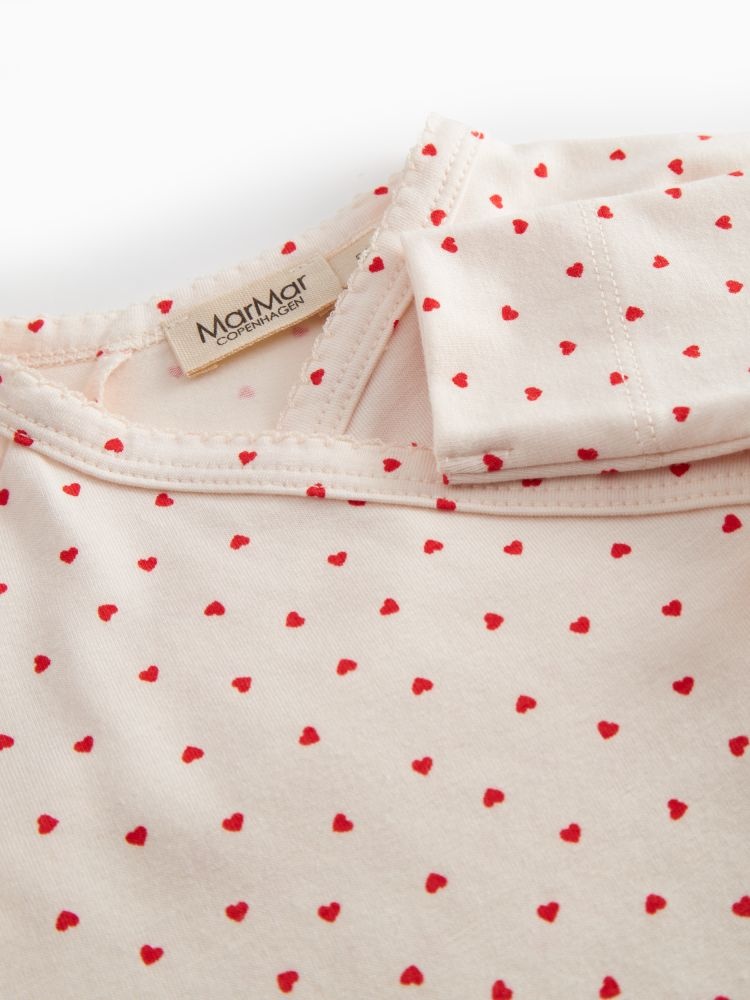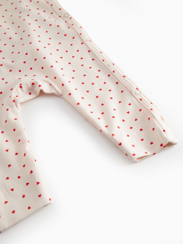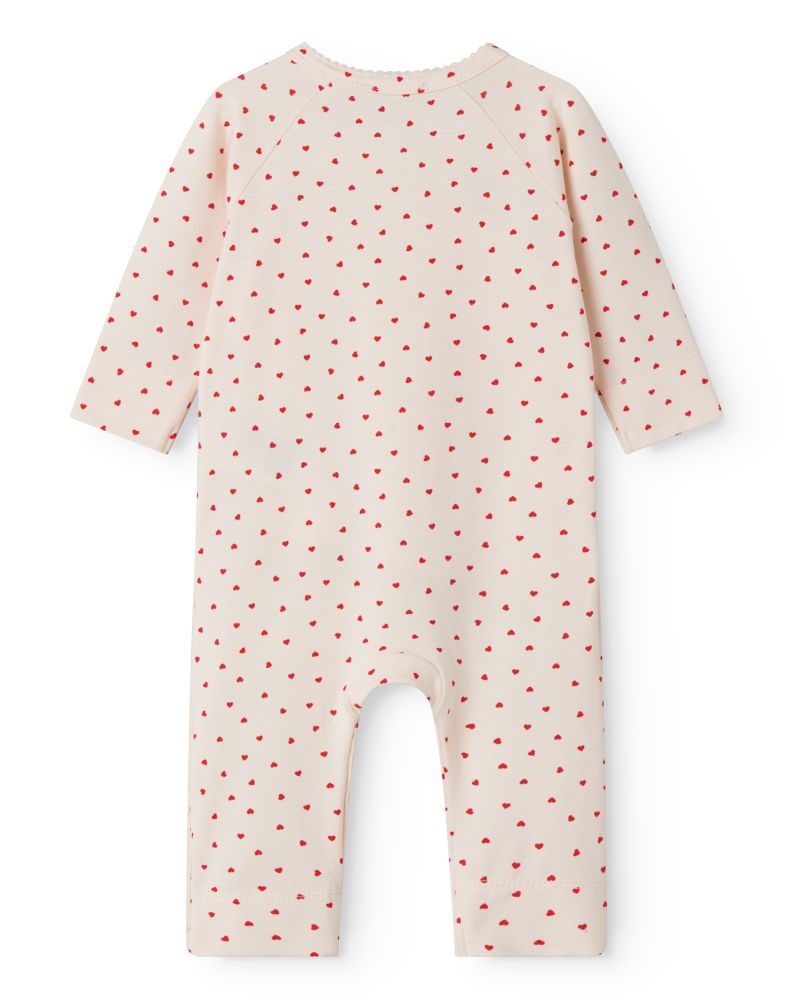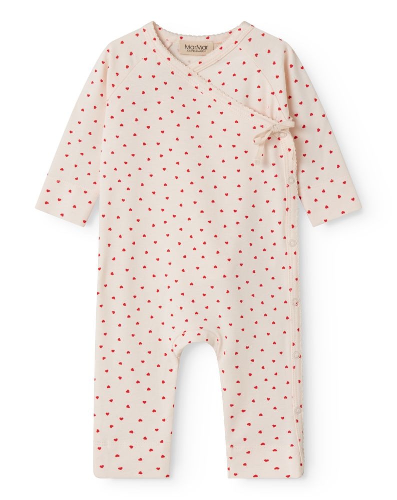 Deze overslag boxpakje van MarMar heeft een zachte, tijdloze uitstraling en is ontworpen voor de allerkleinsten. Het boxpak is uitgevoerd in een lichte crème kleur met een fijne all-over print van kleine rode hartjes, wat zorgt voor een lief en rustig geheel. De overslagsluiting met striklintje en drukknoopjes langs de zijkant en onderaan maakt het aan- en uitkleden eenvoudig, ook bij het verschonen. De lange mouwen en pijpen bieden extra comfort en geborgenheid. Een fijn MarMar boxpak om zowel overdag als ’s nachts te dragen, mooi te combineren met andere items in off-white en roodtinten.