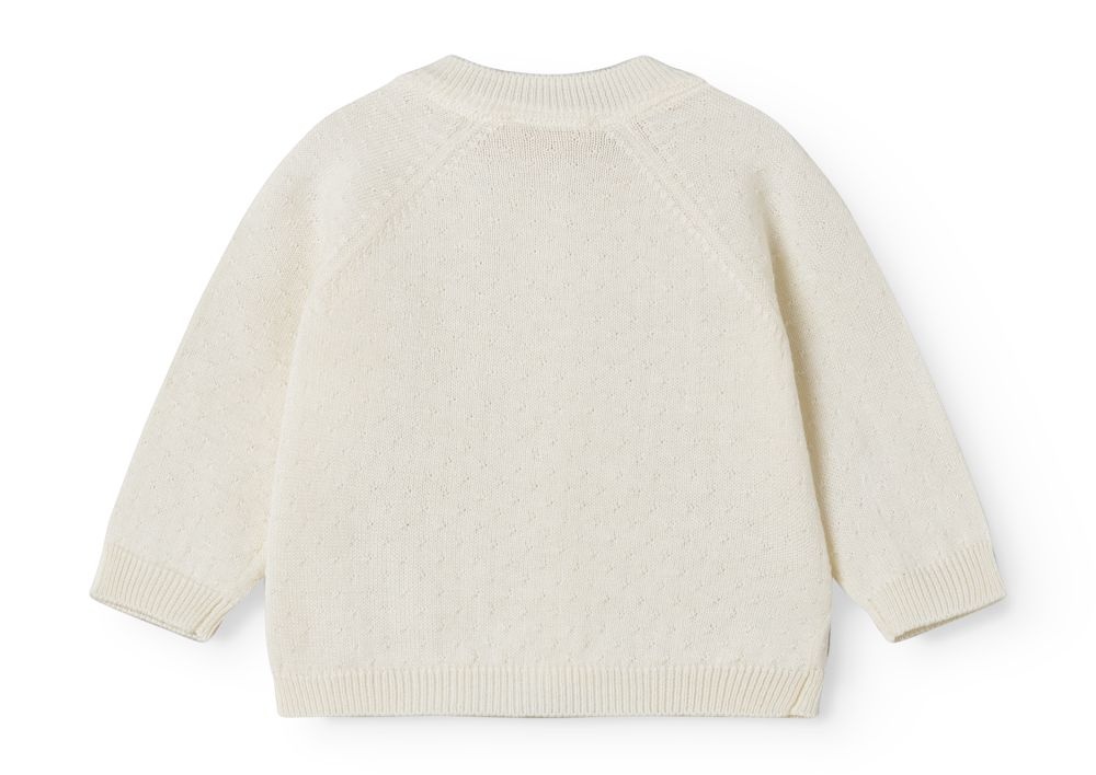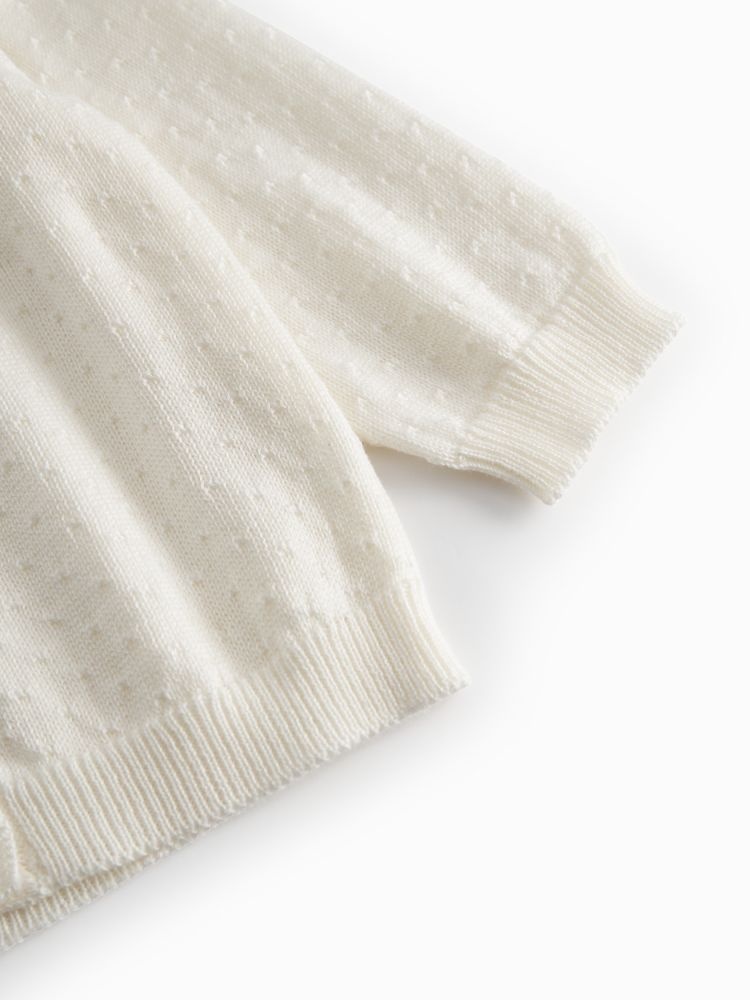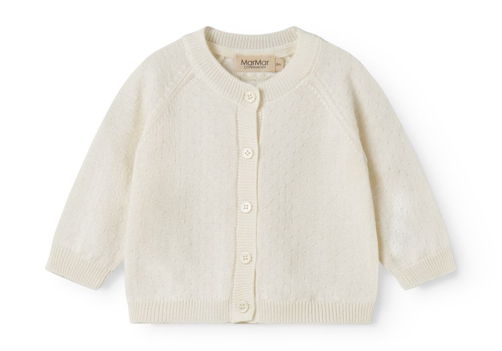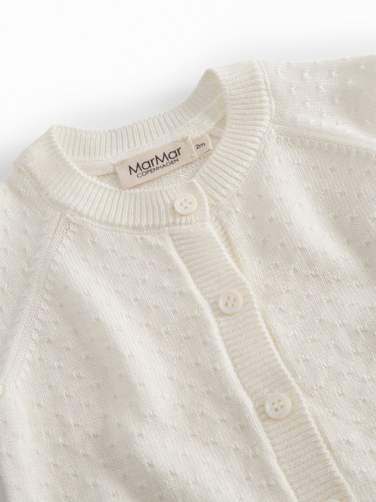 Dit MarMar vest heeft een zachte, verfijnde uitstraling en is uitgevoerd in een witte tint met een subtiel ajourpatroon. Het vestje heeft lange mouwen, een ronde hals en sluit met kleine knoopjes aan de voorkant. De fijne structuur en rustige kleur maken dit vest makkelijk te combineren met het bijpassned broekje of een legging uit de MarMar-collectie. Ideaal als extra laagje, zowel thuis als onderweg. Een tijdloos en praktisch item voor de babygarderobe, passend bij verschillende outfits en kleuren.