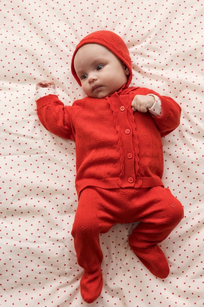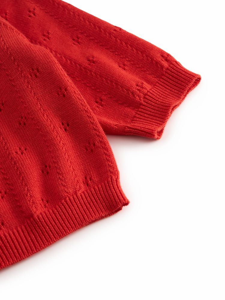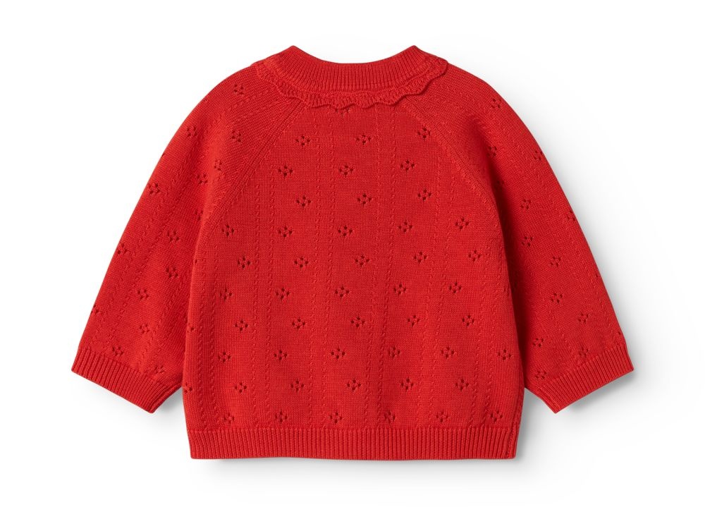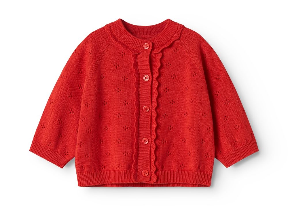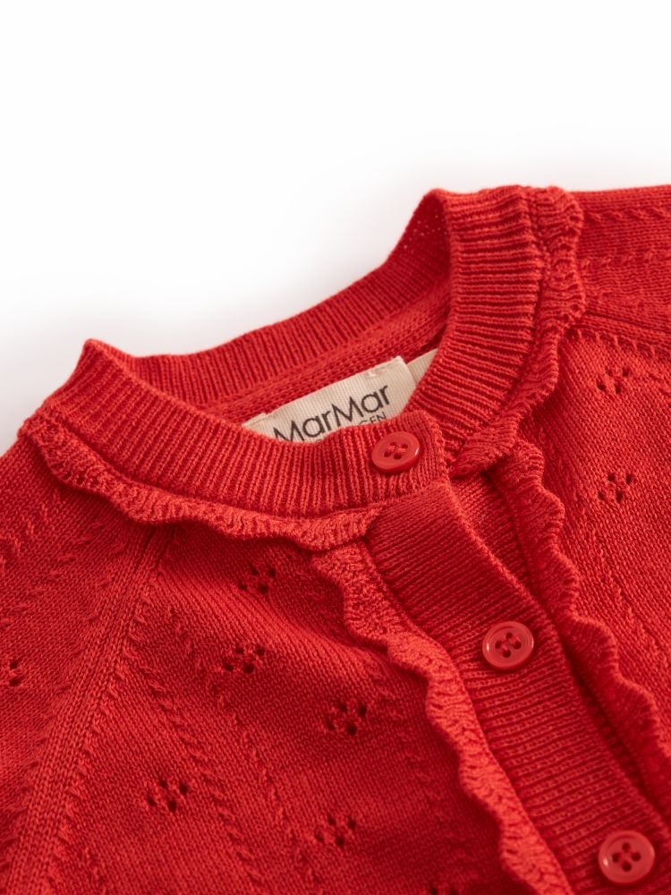 Dit vest van MarMar heeft een klassieke en warme uitstraling en is een fijne toevoeging aan de baby garderobe. Het vest is uitgevoerd in een diepe rode kleur en heeft een subtiel ajourpatroon dat zorgt voor een verfijnd detail. De ronde hals, lange mouwen en knoopsluiting aan de voorkant maken het vest makkelijk aan en uit te trekken. Langs de knopen loopt een sierlijke, licht golvende afwerking die het ontwerp extra karakter geeft. Een tijdloos MarMar vest dat mooi combineert met neutrale tinten, zachte pastels en andere warme kleuren.