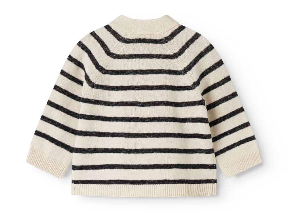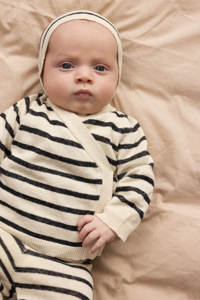 Dit gebreide vest van MarMar heeft een tijdloze wikkelvorm en een rustige, Scandinavische uitstraling. Het vest is uitgevoerd in een zachte crème kleur met contrasterende zwarte strepen, wat zorgt voor een klassiek en makkelijk te combineren geheel. De overslag met striksluiting aan de zijkant maakt het vest praktisch in gebruik en geeft een verfijnd detail. De lange mouwen en fijne boorden zorgen voor een comfortabele pasvorm. Dit MarMar vest staat mooi over een romper, top of shirt en is geschikt voor zowel dagelijks dragen als een iets nettere outfit.