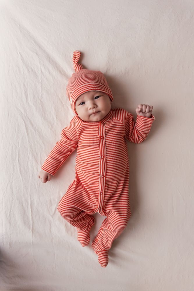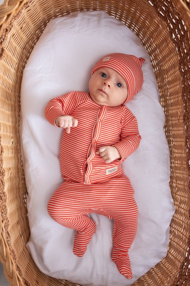 De MarMar babymuts Red Stripe is een zacht en comfortabel mutsje dat ideaal is om het hoofdje van je kleintje warm te houden. De beanie is uitgevoerd in rood met witte strepen en afgewerkt met een speels knoopdetail aan de bovenkant. Dankzij de mix van modal, biologisch katoen en een vleugje elastaan voelt de muts licht en ademend aan, met voldoende stretch voor een fijne pasvorm. Dit newborn mutsje past perfect bij de andere items uit de Red Stripe collectie en is een praktische én stijlvolle aanvulling voor elke babyuitzet.